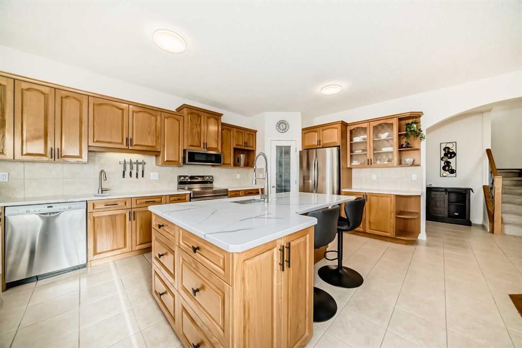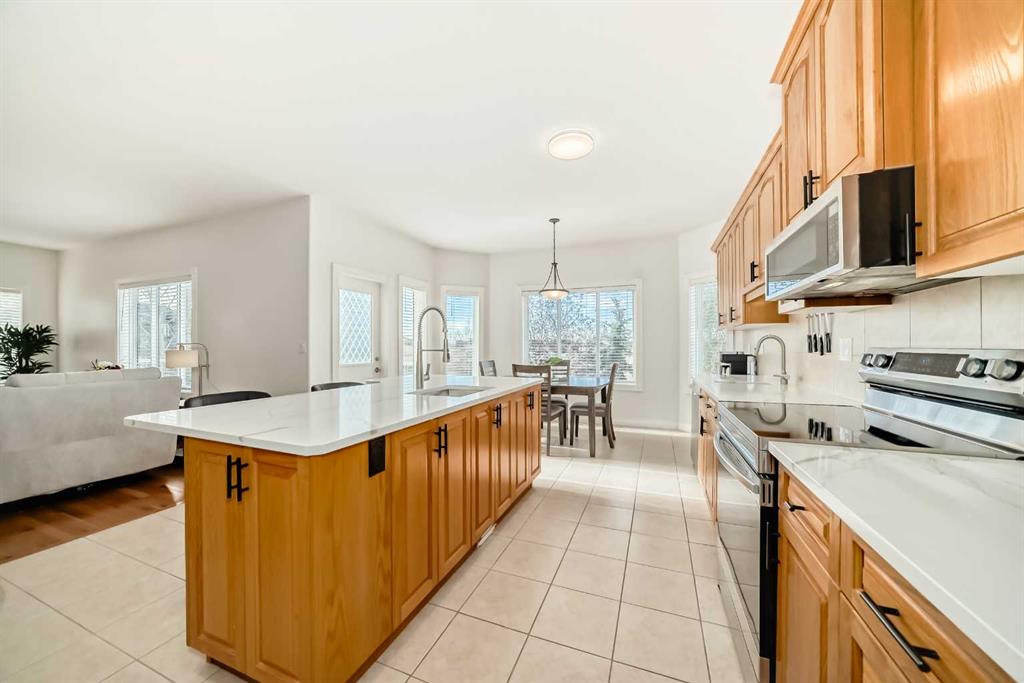 Step inside to an inviting, bright open-concept main floor with expansive windows that fill the home with natural light and showcase tranquil acreage views. The huge kitchen is the heart of the home, featuring newer solid surface countertops, abundant cabinetry, a large island, and plenty of prep space for the family chef. Adjoining the kitchen is a spacious breakfast nook, perfect for casual dining and morning coffee, while the formal dining room — a rare find in today’s newer builds — provides an elegant space for entertaining guests and hosting special occasions.
