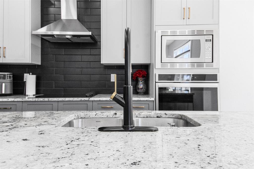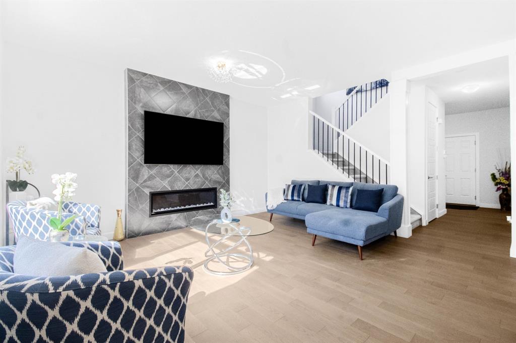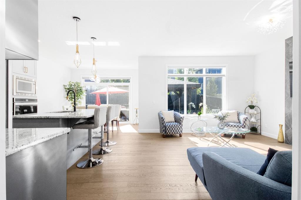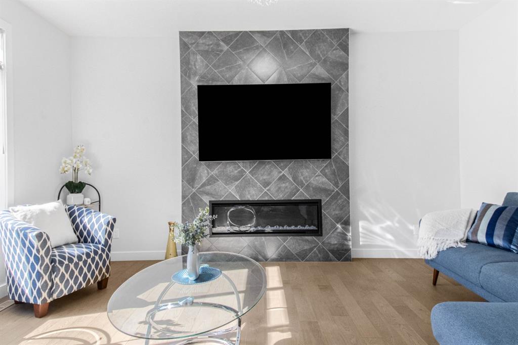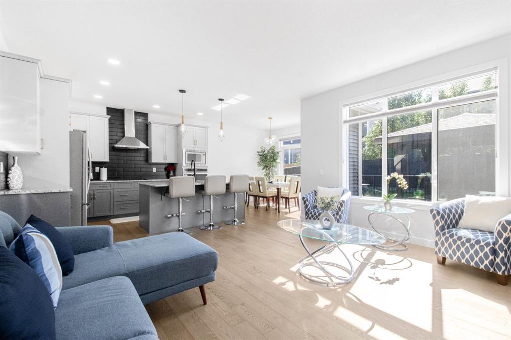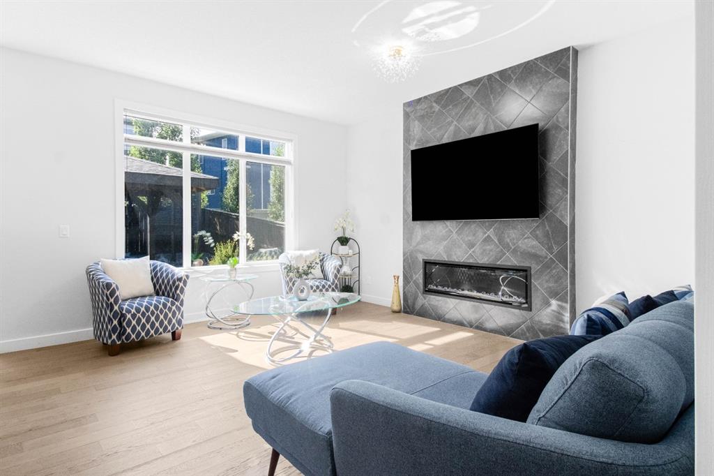 The main level showcases a thoughtfully designed open-concept layout, ideal for both day-to-day living and elegant entertaining. The gourmet kitchen is appointed with two-tone soft-close cabinetry, striking stone countertops, stainless steel appliances including a built-in oven and chimney-style hood fan, upgraded lighting, and a designer tile backsplash. The kitchen overlooks the expansive living room with a sleek gas fireplace surrounded by modern tile. A bright dining area adjacent to the kitchen leads directly to the professionally landscaped west-facing backyard.