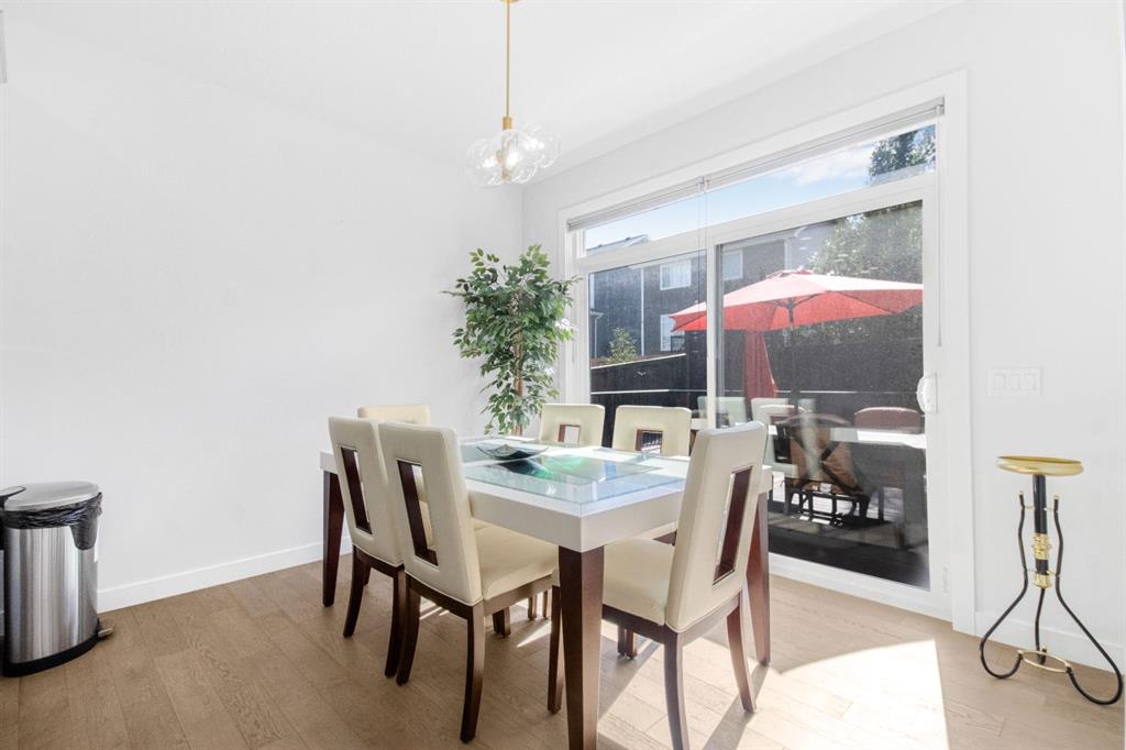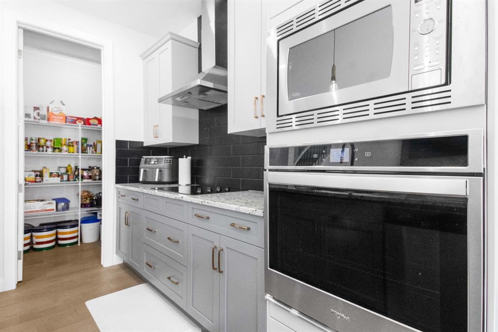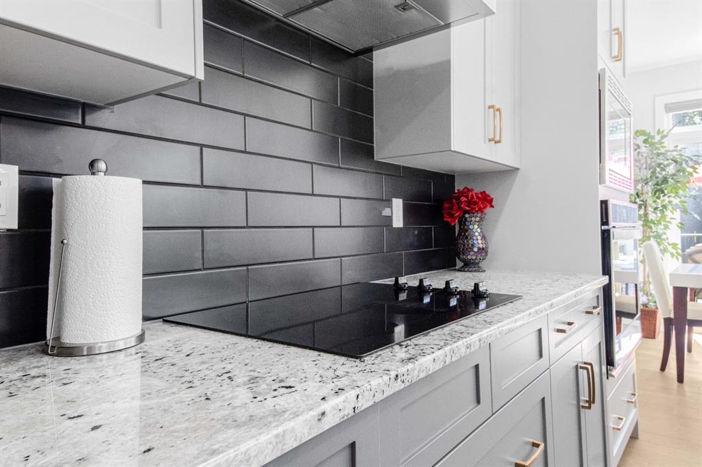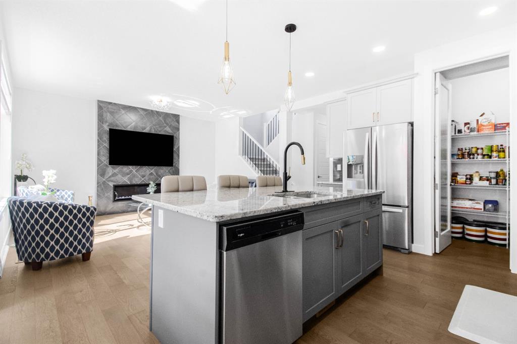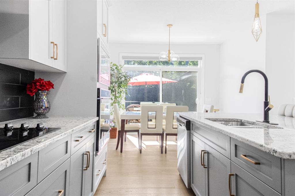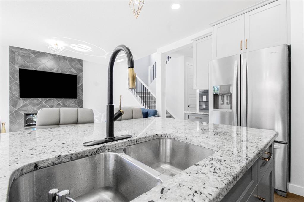 The main level showcases a thoughtfully designed open-concept layout, ideal for both day-to-day living and elegant entertaining. The gourmet kitchen is appointed with two-tone soft-close cabinetry, striking stone countertops, stainless steel appliances including a built-in oven and chimney-style hood fan, upgraded lighting, and a designer tile backsplash. The kitchen overlooks the expansive living room with a sleek gas fireplace surrounded by modern tile. A bright dining area adjacent to the kitchen leads directly to the professionally landscaped west-facing backyard.