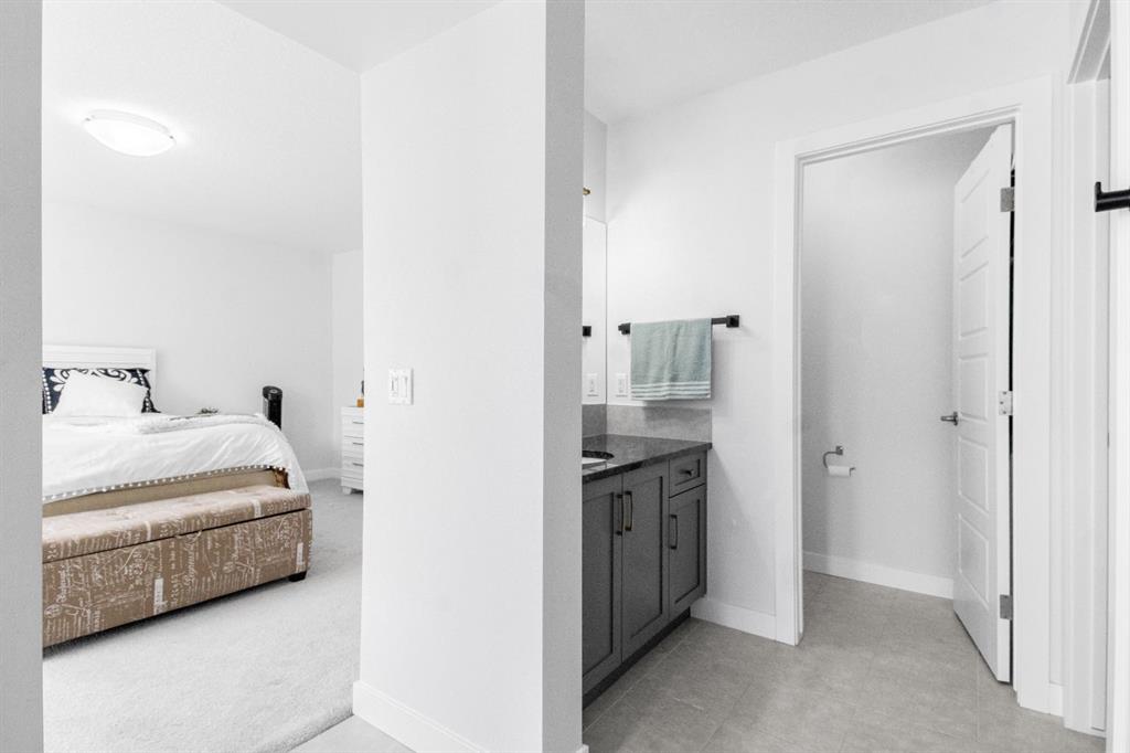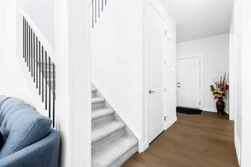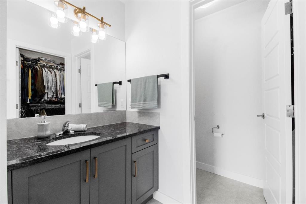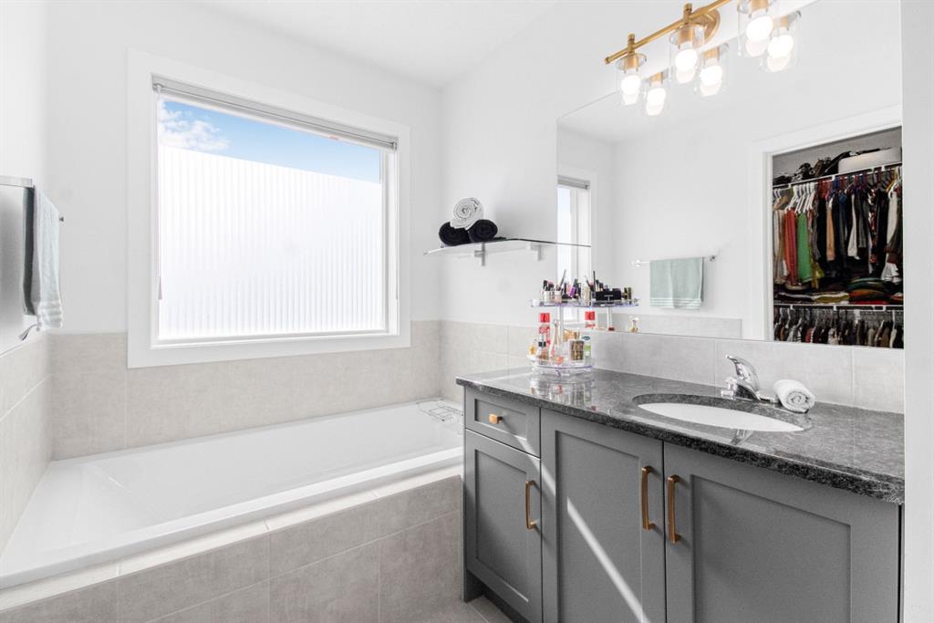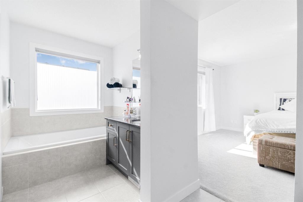 Upstairs, a contemporary open-riser railing leads to a large central bonus room. Two generously sized bedrooms, a well-appointed four-piece bathroom with stone counters, and an upper-level laundry room add convenience and comfort. The spacious primary suite offers a luxurious escape, complete with two walk-in closets and an elegant ensuite featuring dual vanities, stone countertops, a deep soaker tub, and a fully tiled glass walk-in shower.