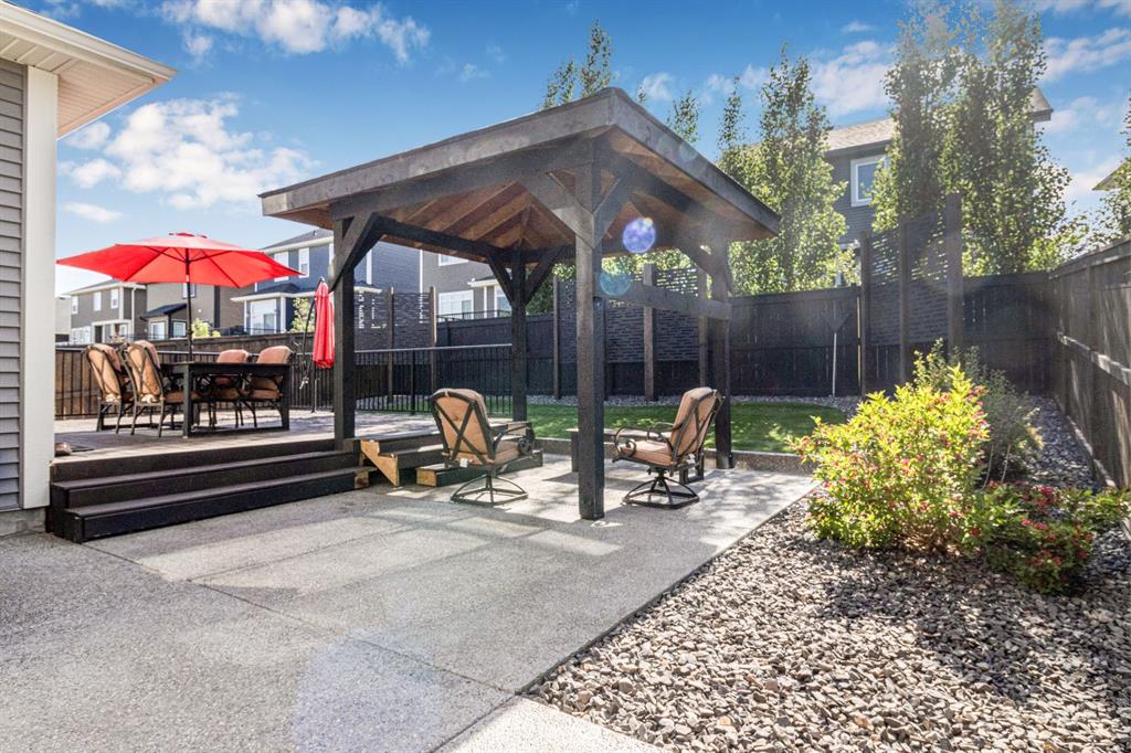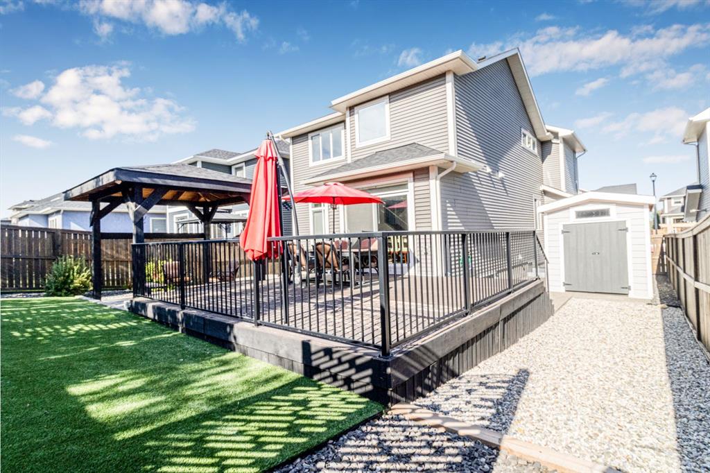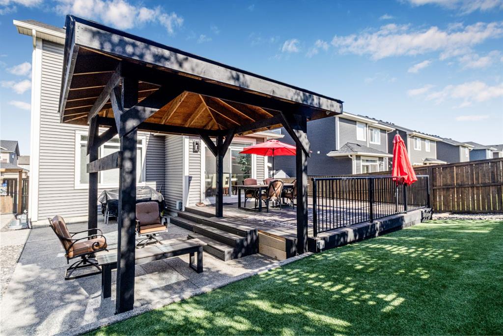 The outdoor space offers a private retreat, designed with over $60,000 in high-end landscaping upgrades. Features include maintenance-free artificial turf, privacy screens, a tiered composite deck, exposed aggregate patio and pathways, a custom pavilion, and a matching storage shed—ideal for outdoor entertaining or quiet relaxation.