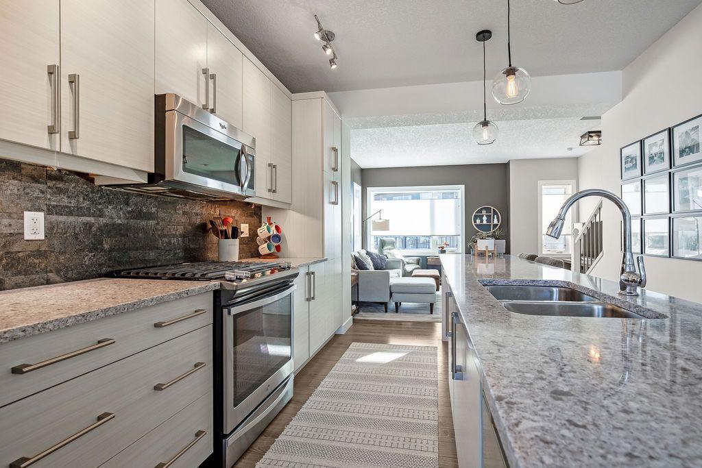 The open-concept main living area is designed for both everyday comfort and entertaining. The kitchen features ungraded appliances including a gas stove, generous cabinetry, and a spacious island that flows seamlessly into the dining and living areas. Thanks to the home’s end-unit position and elevated sightlines, natural light pours in, creating an inviting atmosphere throughout the day.