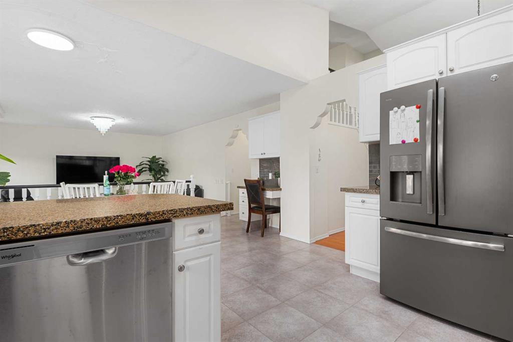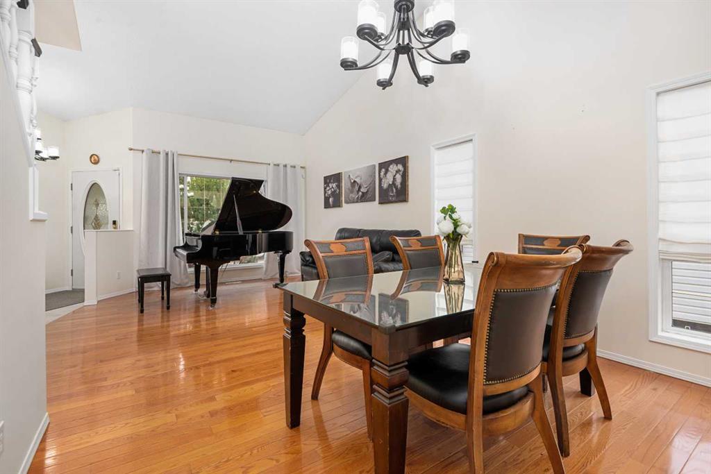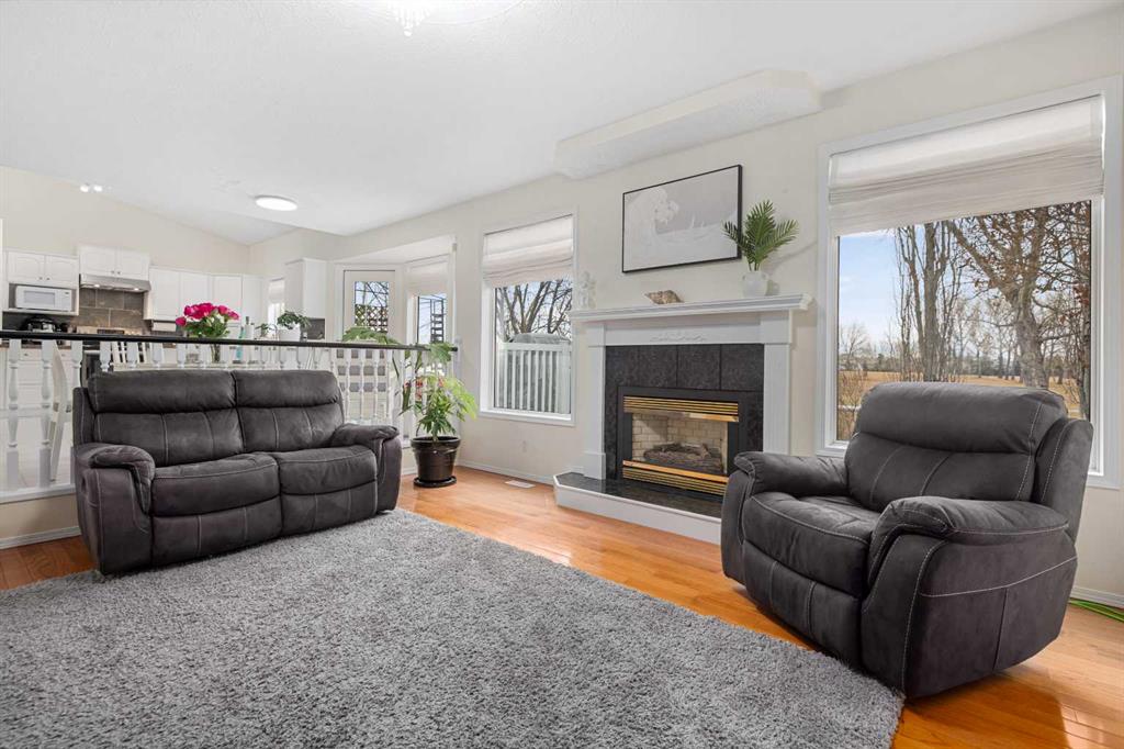 Upon entry, you’re greeted by high vaulted ceilings in the living room, dining area, and kitchen, creating an airy and welcoming atmosphere. Large windows fill the home with natural light, enhancing the open and spacious feel throughout. The main floor offers a cozy sunken family room with a gas fireplace, perfect for relaxing evenings, as well as a versatile main floor bedroom ideal for a home office or guest room.