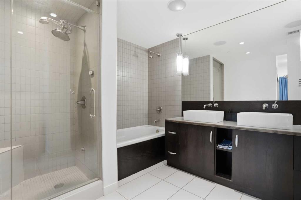 The spacious primary bedroom easily accommodates a king sized bed with nightstands and a large television, while the walk through closet leads to an impressive 5 piece spa inspired ensuite. The ensuite is one of the largest in the building and features dual sinks, a deep soaker tub, and a luxurious steam shower, creating a true at home retreat. For added convenience, the front loading washer and dryer are discreetly located within the ensuite. A separate guest bathroom provides additional comfort and privacy for visitors.