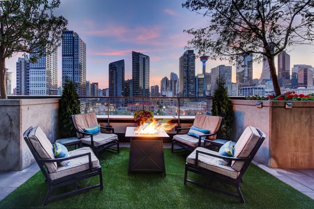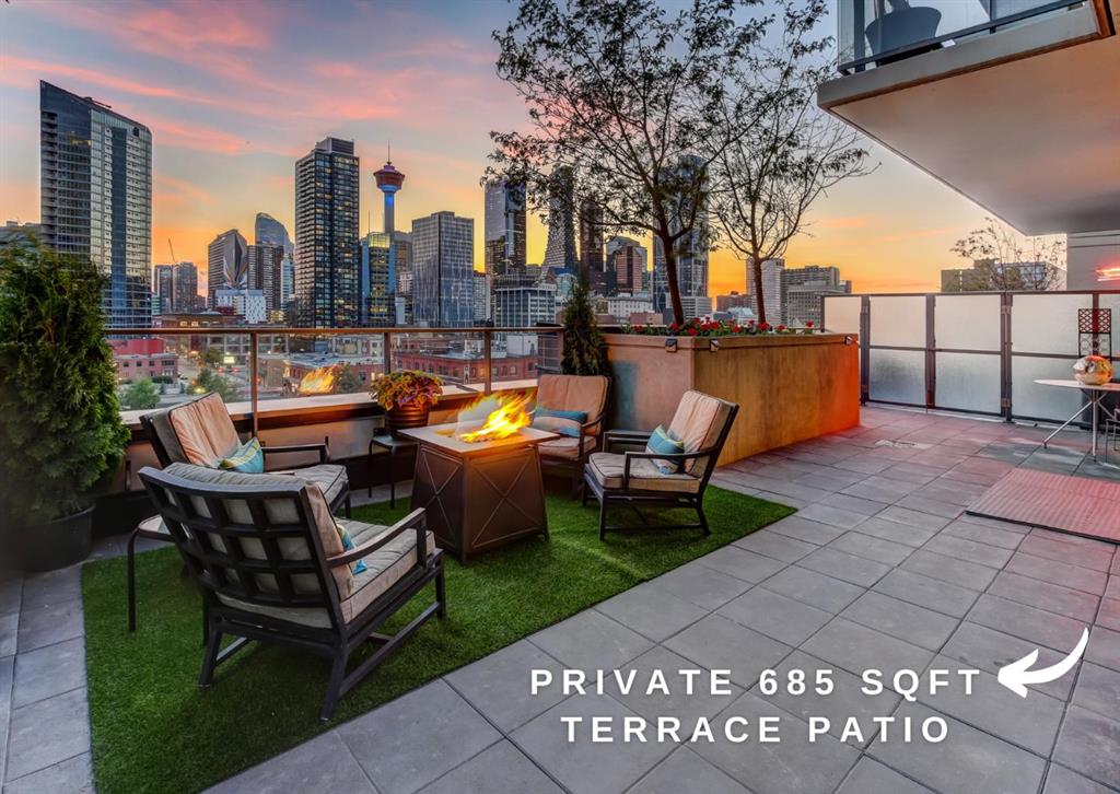 Love downtown living but craving outdoor space? This stunning SW corner terrace unit offers the best of both worlds – a rare, wrap-around 685 sqft terrace with breathtaking views of the city skyline. Located on the 7th floor, this bright and spacious corner layout features 10’ ceilings and expansive floor-to-ceiling windows that flood this unit with natural light and truly bring the outdoors in. The sleek modern kitchen is thoughtfully designed with built-in appliances, quartz countertops, and a convenient microwave shelf to keep your counters clear and functional. The primary bedroom includes upgraded custom closet built-ins to maximize storage, along with a 4-piece ensuite for added comfort. A true bonus: titled indoor tandem parking, rarely found in the building, ideally situated on the 4th level right next to the elevator doors (and only 3 floors down the stairs), with natural light streaming into the parkade through shaded windows. Perfect for the urban professional, you’re just steps from the Saddledome, downtown, C-Train, river pathways, shops, restaurants, and all amenities. Residents of The Guardian enjoy premium amenities including concierge service, a fully equipped fitness centre (directly below unit), social lounge, workshop, visitor parking, and a beautifully landscaped garden terrace with BBQs. With stairs conveniently nearby, you’ll never have to wait long for an elevator. Don’t miss this rare opportunity to enjoy downtown living with exceptional outdoor space!