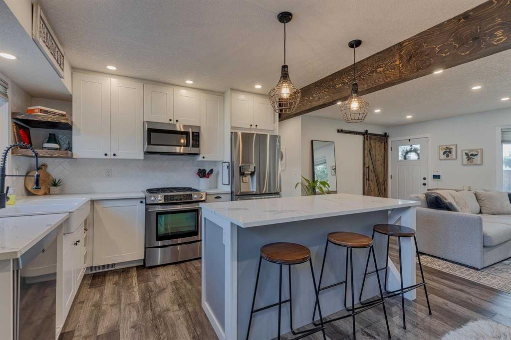 Welcome to this renovated bungalow nestled in the heart of Southwood, one of Calgary’s most sought-after southwest communities. With mature tree-lined streets, spacious lots, and excellent access to transit and amenities, Southwood offers an established inner city location. Step inside to discover a home reimagined from the inside out; every detail has been thoughtfully upgraded for modern living. This home offers designer finishings throughout, from the elegant bathrooms to the sleek luxury vinyl plank flooring that flows throughout the main level. The exterior is equally striking with durable Hardie board siding, giving both style and low-maintenance resilience. The chef’s kitchen provides timeless quartz countertops, stainless steel appliances, and a functional layout; making it ideal for both casual meals and entertaining. South-facing windows flood the home with natural light, creating a bright and warm home. The primary bedroom is a true retreat. It features a walk-in closet and a luxurious ensuite bathroom with dual vanities and an oversized shower. One of the property’s standout features is the backyard oasis. Enjoy privacy thanks to mature trees, and appreciate the beauty and structure provided by a stunning stone retaining wall that adds both elegance and definition to the outdoor space. This secluded setting is ideal for relaxing, entertaining, or gardening in peace. Parking and storage are well accommodated with a large detached double garage, plus an extra pad for additional vehicles or RV parking. Central A/C ensures comfort during Calgary’s warmer months. Downstairs, the fully finished basement offers a generously sized bedroom with a walk-through closet and its own ensuite. The basement also offers a wet bar, perfect for a recreation area or guest quarters. Best of all, it has a separate entrance, making conversion to a legal basement suite straightforward for future flexibility (subject to approval and permitting by the city). This is a rare opportunity to own a turnkey, thoughtfully reimagined home in a mature community with excellent future potential.