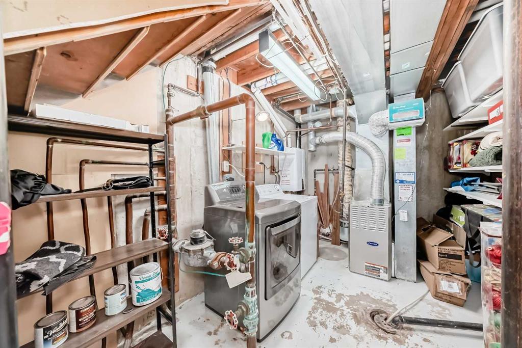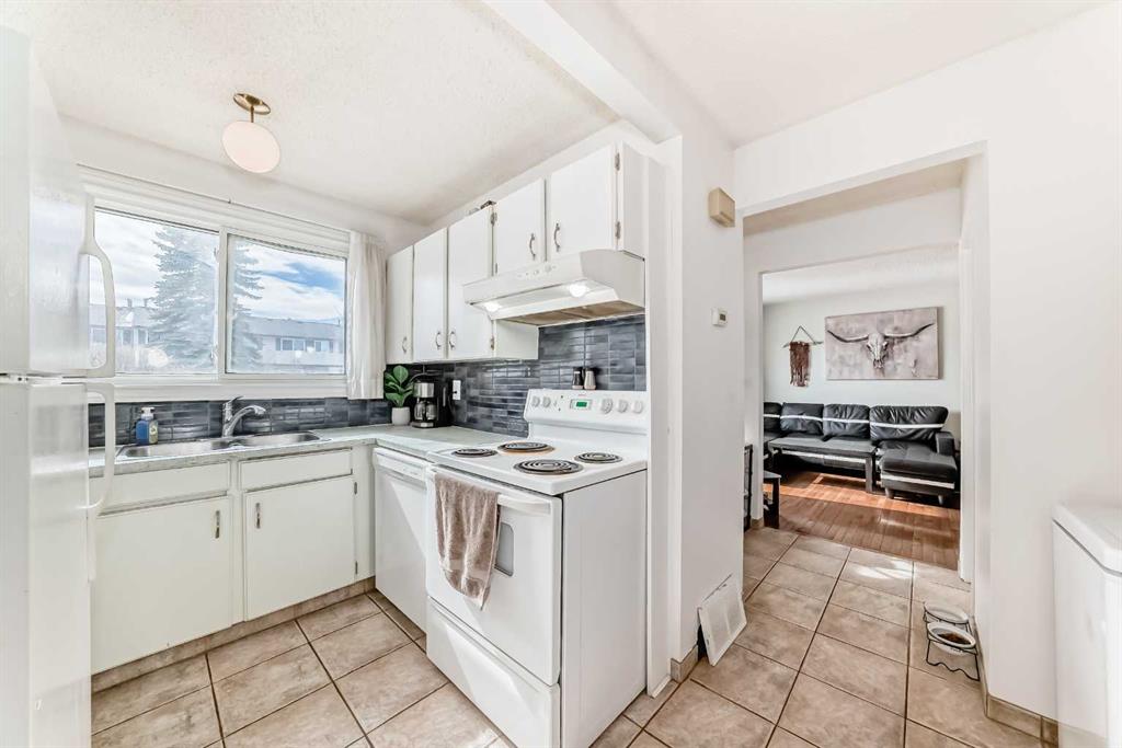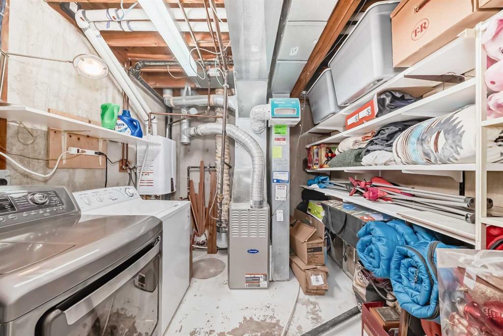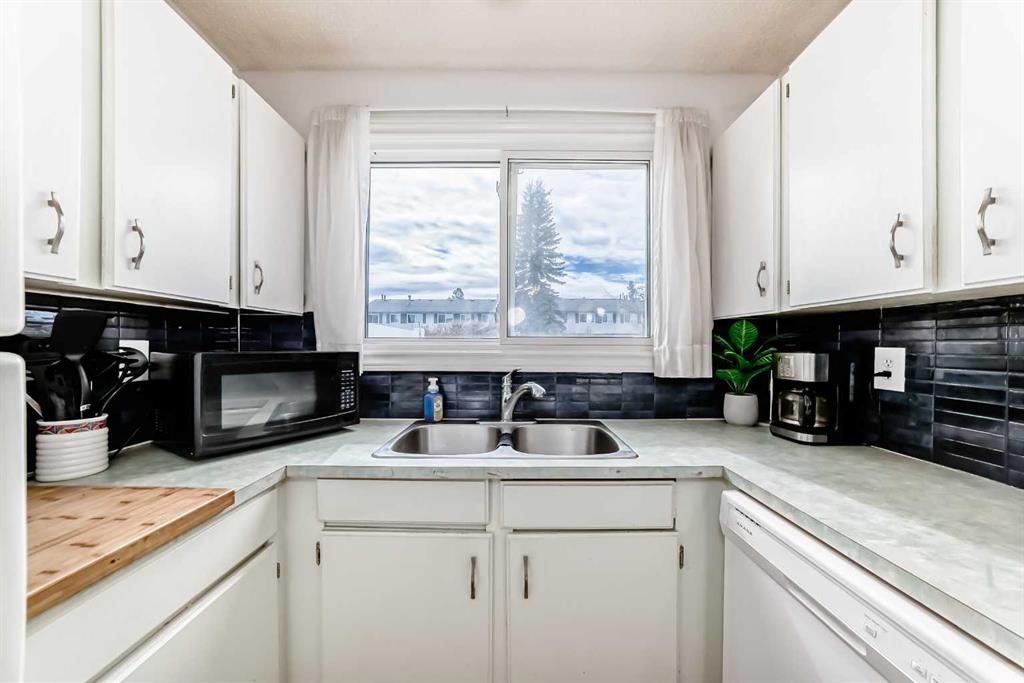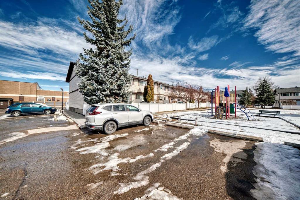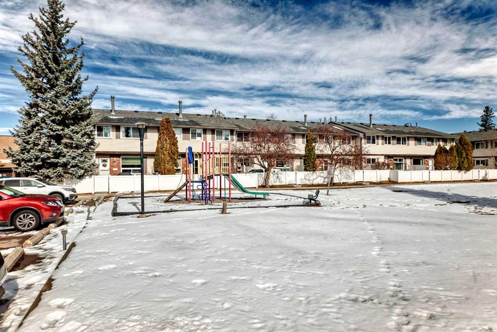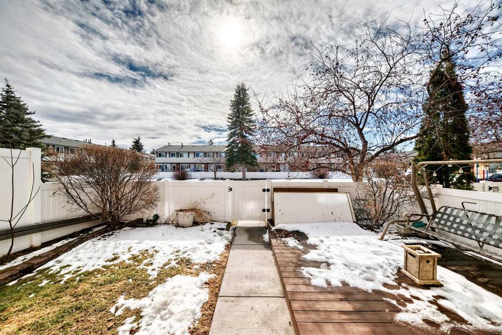 Upstairs you’ll find two large bedrooms, plenty of storage, and a 4-piece bathroom. The lower level adds approximately 250 sq. ft. of additional living space, including a recreation room, storage room, and laundry/mechanical area. The home has been well maintained but remains largely in original condition—perfect for buyers looking to purchase at a great price and upgrade or personalize to their taste. All the big-ticket items have already been updated, including six newer triple-pane windows (2020), a newer tankless hot water system, and a newer furnace. This is one of the best locations in the complex, featuring a sunny south-facing fenced courtyard that looks directly onto the green space and tot lot. Visitor parking is just steps away.
