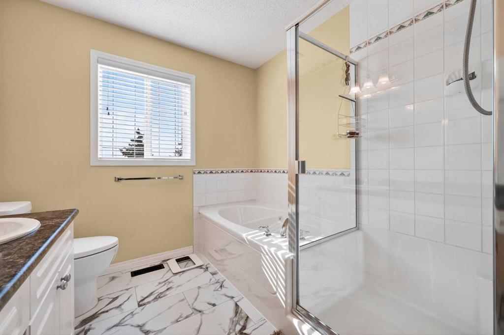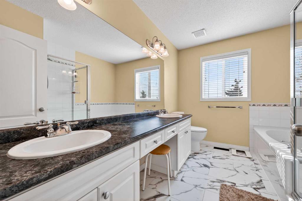 Upstairs, you’ll find two generously sized bedrooms, each offering its own ensuite bathroom and walk-in closet, along with the added convenience of upper-level hall laundry. The primary suite serves as a private retreat, featuring a luxurious ensuite with a soaker tub, separate walk-in shower, double sink vanity, and an expansive walk-in wardrobe.