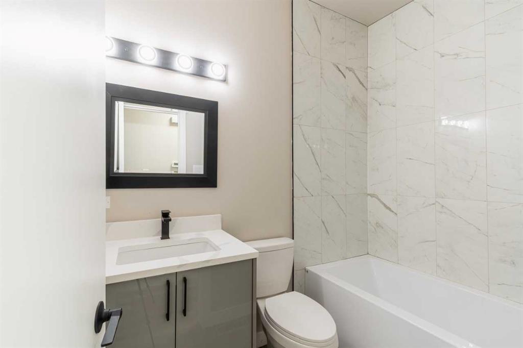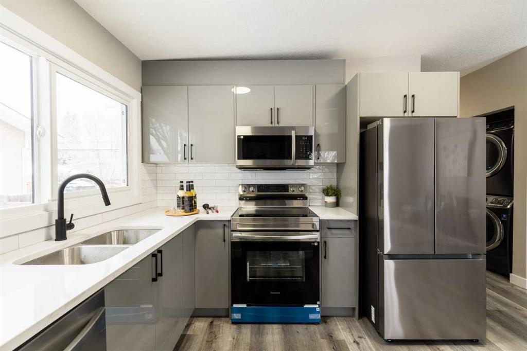 The property offers a total of 3,610 sq ft of developed living space. Each main floor is approximately 1,032 sq ft and features 3 bedrooms and 1.5 bathrooms with an open-concept layout, new windows, recessed lighting, and modern finishes throughout. Kitchens are finished with contemporary cabinetry, quartz countertops, stainless steel appliances, over-the-range microwave, and stacked washer and dryer.