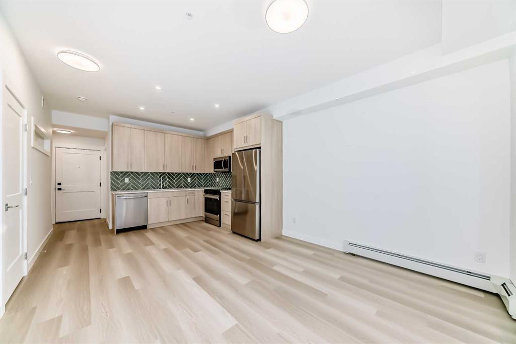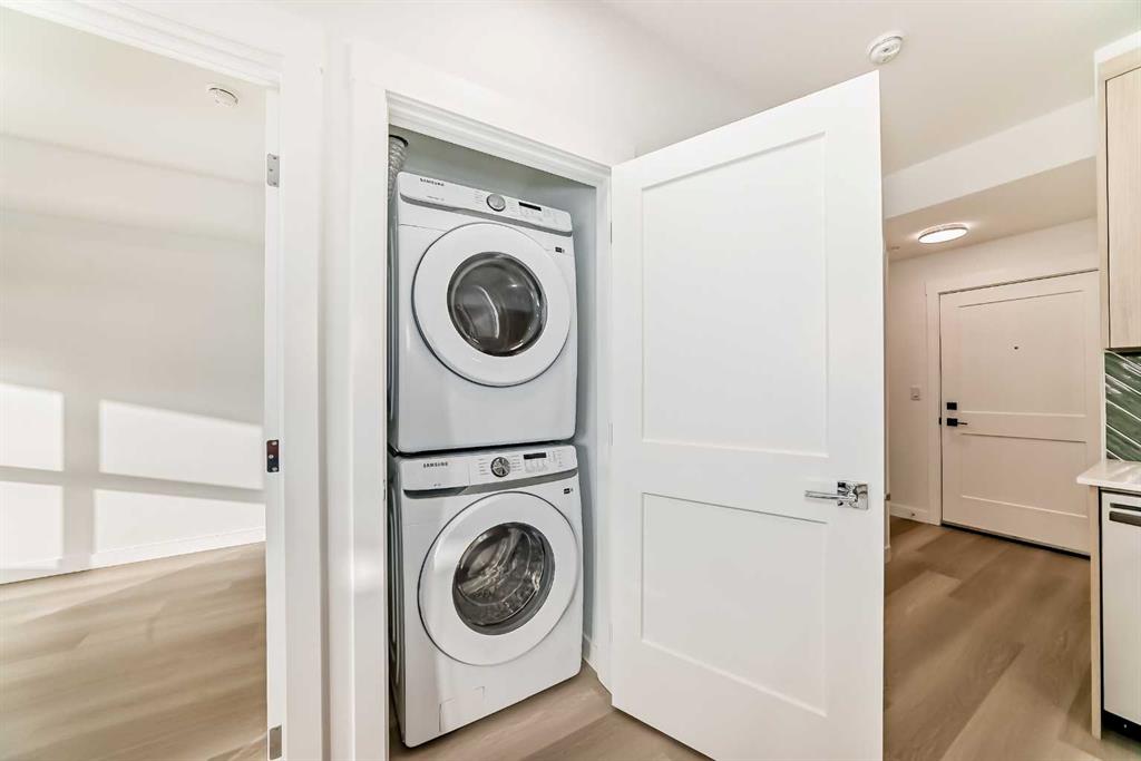 Welcome to the Curnoe 2 by Logel Homes—a well-designed unit featuring full-height cabinet fronts, quartz countertops, luxury vinyl plank flooring throughout, and tile in the bathroom. The upgraded kitchen includes a modern backsplash, a premium sink and faucet, and comes with stainless steel appliances. Enjoy year-round comfort with air conditioning, plus the convenience of an in-suite washer and dryer. Nine-foot ceilings and large windows provide plenty of natural light. This home includes a titled underground parking stall and is backed by the Alberta New Home Warranty. Located close to shopping, public transit, and major routes like Deerfoot and Stoney Trail, it offers easy access across the city. With affordable condominium fees, this is a great opportunity to own a well-appointed home in a convenient location.