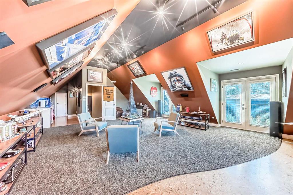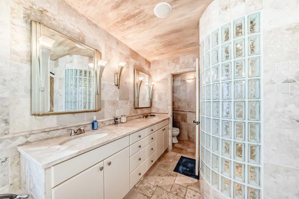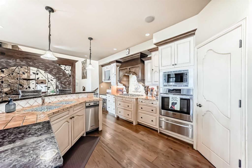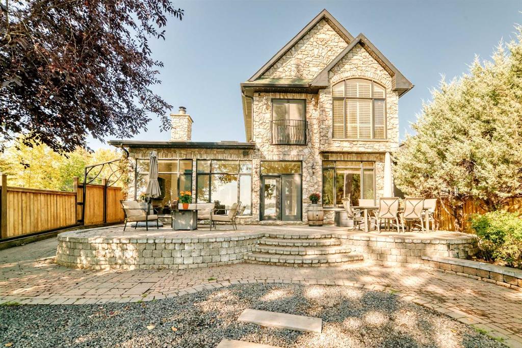 The main level has in-floor heating and includes a den, a convenient half bath, and a bedroom with a 3-piece ensuite and walk-in closet. A striking tiered waterfall divides the family room and kitchen, complementing the one-of-a-kind stone fireplace.