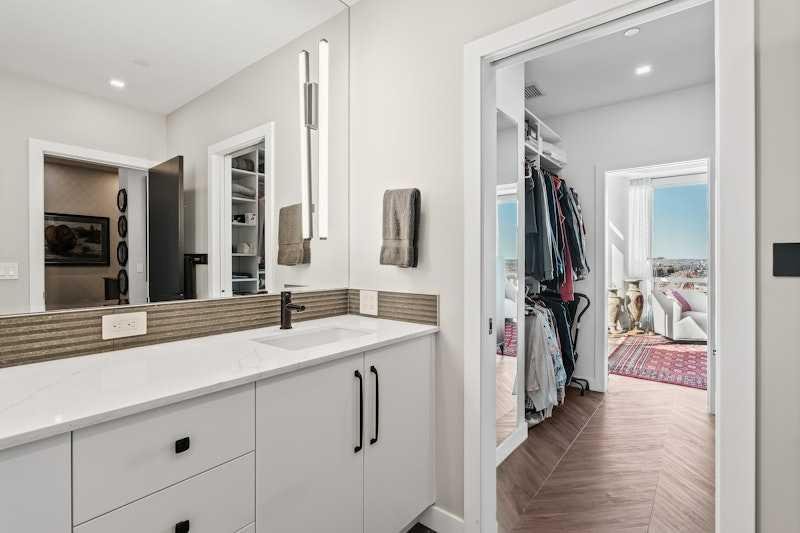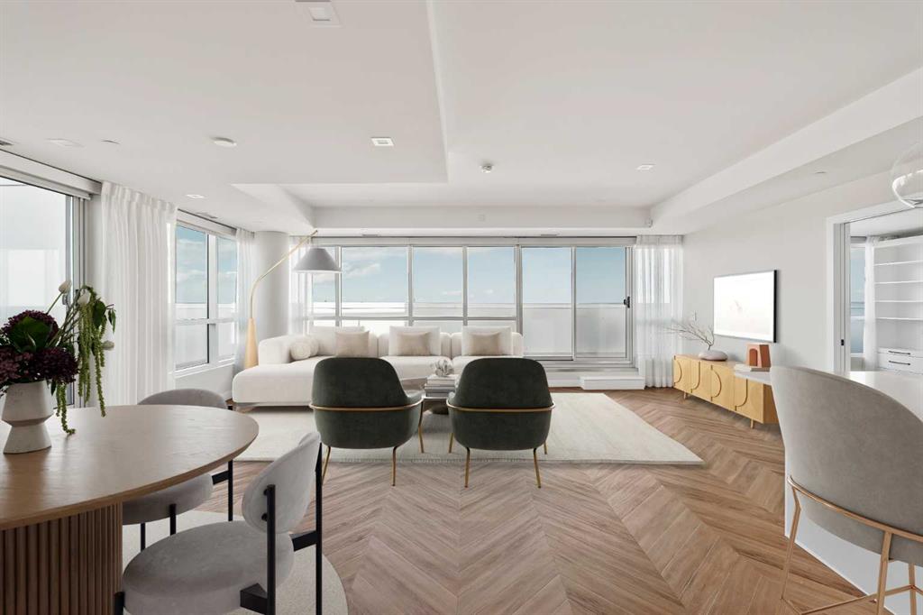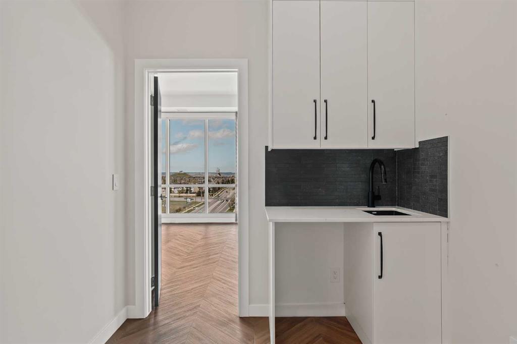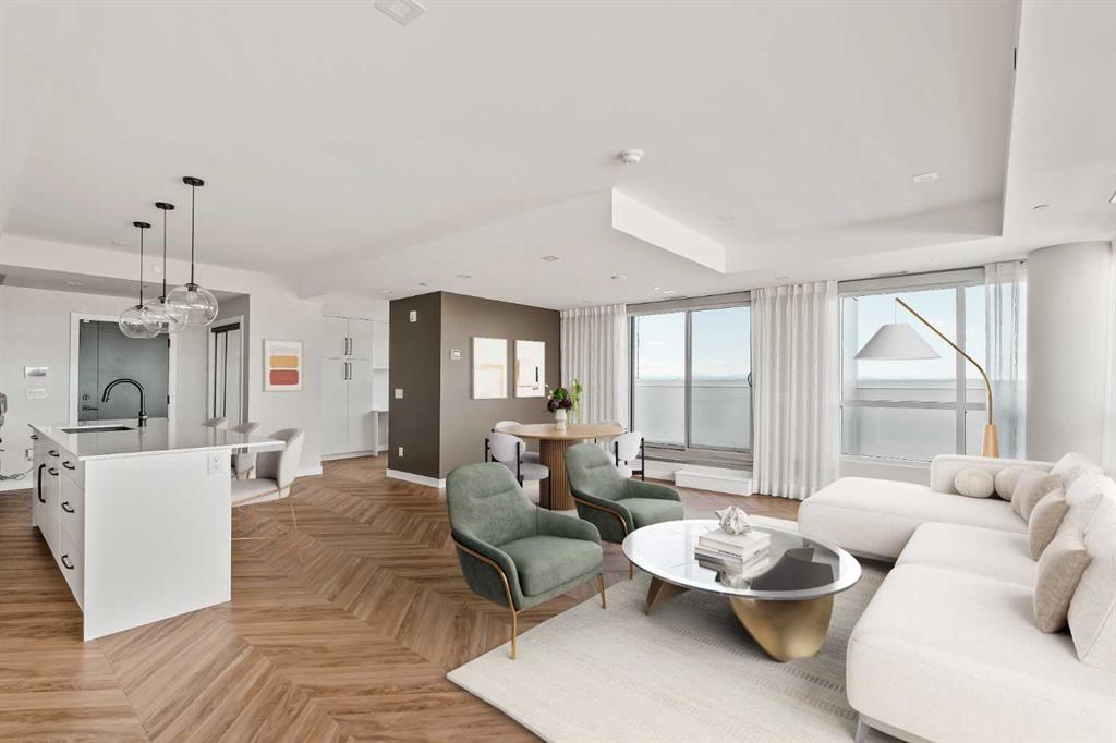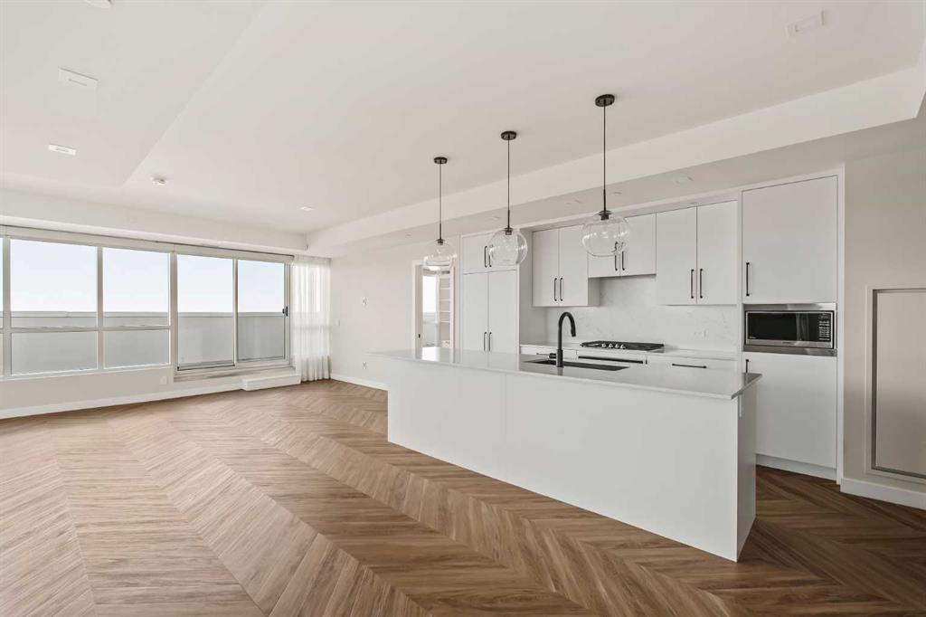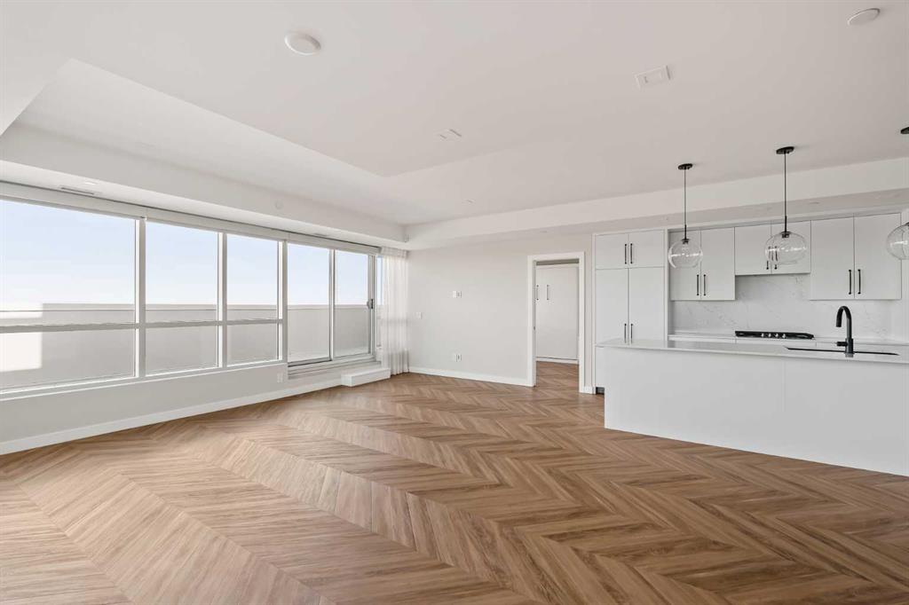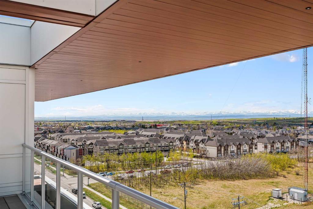 Proudly presenting Suite 717, the most coveted West facing corner penthouse in the prestigious Gateway buildings. This extraordinary home offers stunning panoramic mountain views, evening sunsets, impeccable custom upgrades, and a lifestyle of sophistication and comfort. Thoughtfully designed, the home features electric blackout blinds on all windows, a high-end security system with burglar-proof locks, and a versatile main floor with a custom Murphy bed, built-in office, two separate office spaces, refined window treatments, a customized laundry room, and comfort-raised toilets. The gourmet kitchen is a true showpiece, boasting a single bowl sink, garburator, oversized globe pendant lights, dimmable lighting, and upgraded pull out waste bins. Additional luxuries include two premium parking stalls directly outside of the elevator, two storage lockers, accessibility features throughout, and a bonus spacious in suite storage area under the stairs. This penthouse also comes with air conditioning, chevron flooring, quartz countertops, LED square pot lights, solid core doors, soft close drawers, and a gas line on the patio. Built in 2019 with concrete construction and exceptional soundproofing, this boutique style building is unlike anything else in the city. Residents enjoy access to a rooftop patio, stylish residents’ lounge, concierge service, visitor parking, EV chargers, and secure bike storage. Located in the Trendy West District this property is steps from Sobeys, Big T’s BBQ, UNA Pizza, Deville Coffee, F45 Gym, Hankki, YYC Cycle, and more, with quick access to Old Banff Coach Road, Stoney Trail, and nearby mountain escapes. The fast growing West District will soon offer over 1 million square feet of retail and commercial space, designed for a walkable lifestyle with 20-ft sidewalks and bike paths. Just 15 minutes from downtown, 5 minutes to Winsport, and 60 minutes to the Rockies, Suite 717 offers unmatched urban convenience with a breathtaking natural backdrop. Book your showing today!