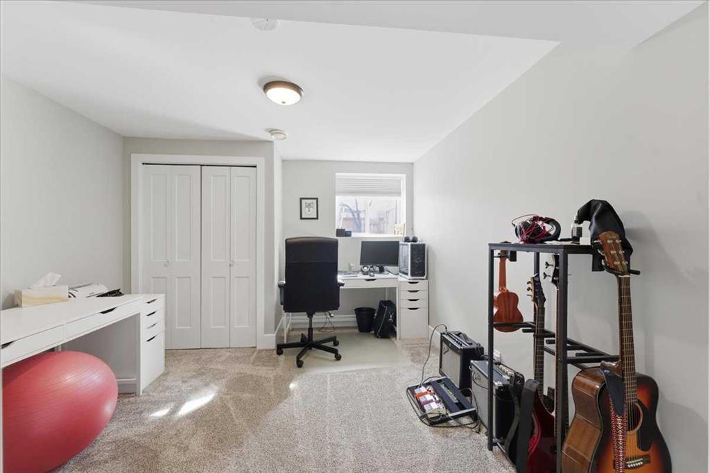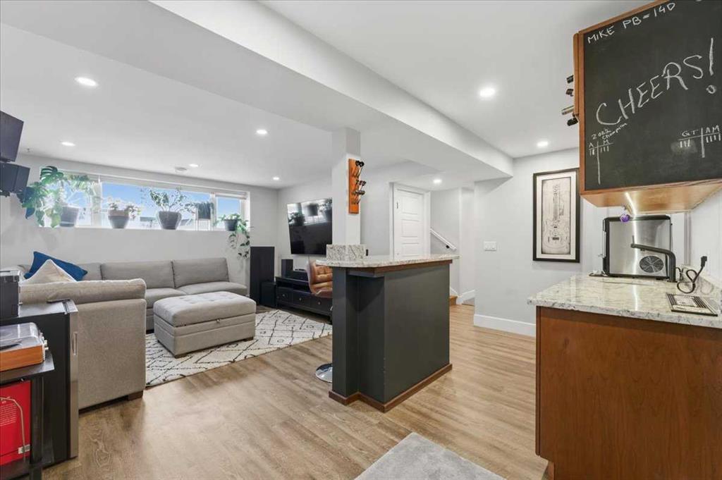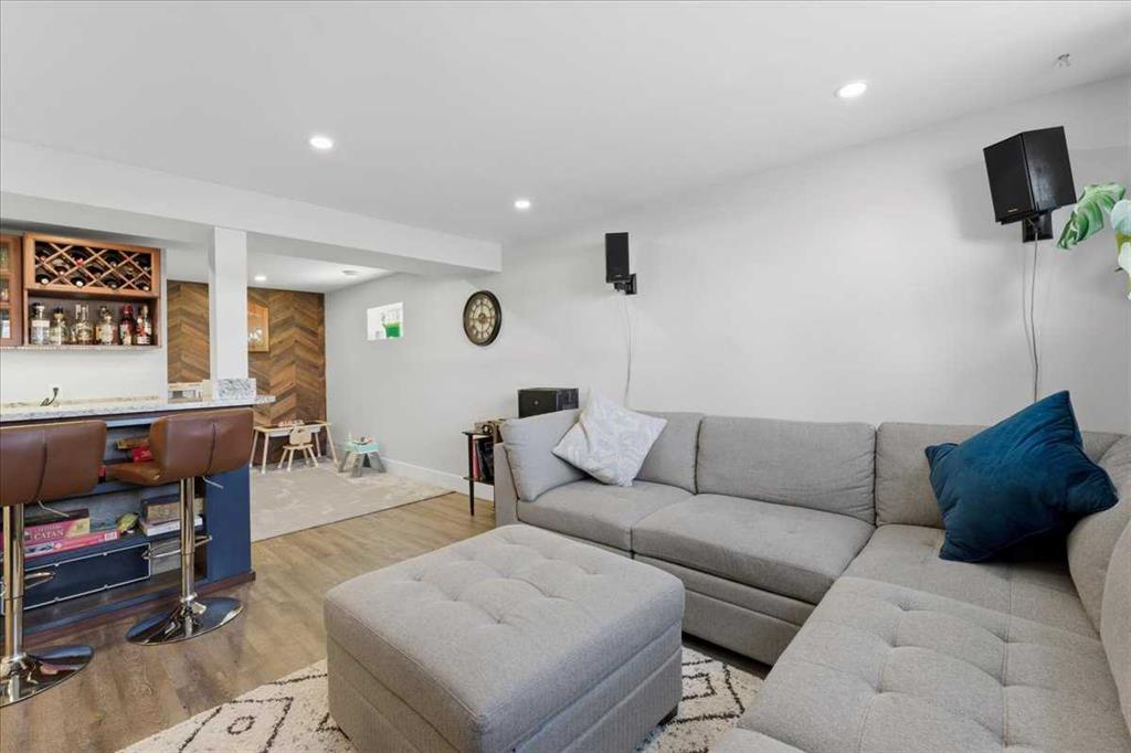 Downstairs, you’ll find two additional bedrooms with built-in desk spaces, a full bathroom with tiled surround, a spacious rec room with wet bar, and durable vinyl plank flooring throughout. A separate laundry room includes washer and dryer.
