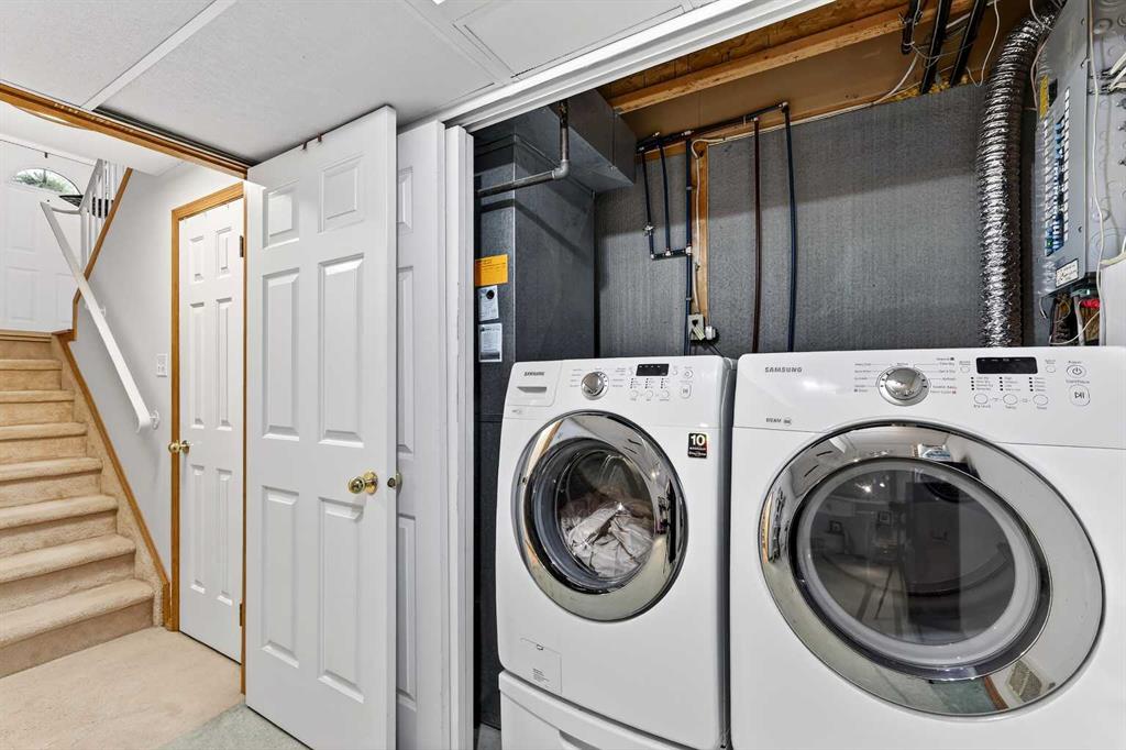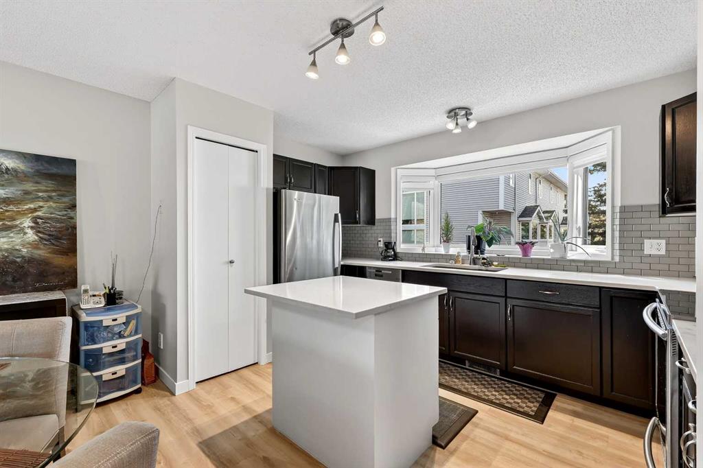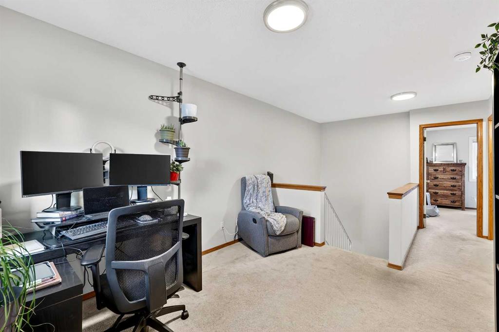 This townhome is perfectly situated just steps from St. Gregory School and Optimist Athletic Park, and only minutes from Signal Hill Centre, offering an exceptional and convenient location. The lower living area features new luxury vinyl plank flooring, high ceilings, and abundant natural light, creating a bright and welcoming atmosphere. The adjoining deck provides an inviting outdoor retreat, ideal for relaxing or entertaining. The window in the lower living area is equipped with remote-controlled window coverings for added convenience. The kitchen continues with the same new vinyl plank flooring and offers quartz countertops, stainless steel appliances, ample counter and cabinet space, and a large west-facing bay window, also fitted with remote-controlled coverings. A conveniently located powder room completes the main level.Upstairs, the home features a spacious primary bedroom with a walk-in closet, a second bedroom, a full 4-piece bathroom, and a versatile loft or flex space perfect for a home office, reading nook, workout area, or additional living space. The basement adds even more functionality with an additional room that includes a washer and dryer and is ideal for a private office, hobby space, or extra flex area. Recent updates include the removal of Poly-B plumbing, fresh paint in 2023, new triple-pane windows in 2025, a 40-gallon hot water tank replaced in 2018 with a 10-year warranty, and a roof replacement in 2012. An attached garage provides secure parking and added convenience. Ideally located close to schools, parks, shopping, transit, and major routes, this Glenbrook townhome offers outstanding value for first-time buyers, professionals, or anyone looking to downsize without sacrificing space or location.