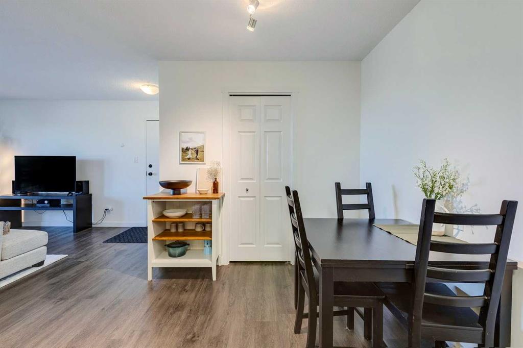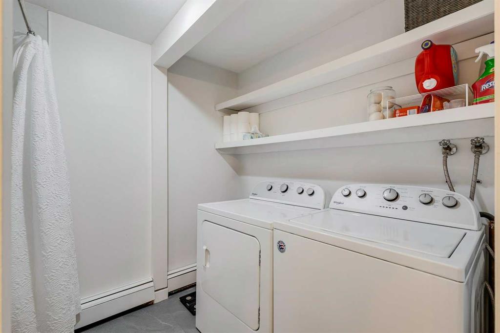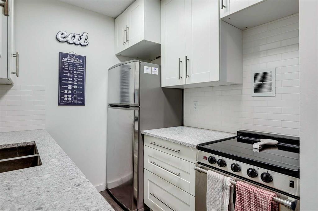 The unit features open living and dining space with large windows that look toward the city skyline. The primary bedroom is generously sized and can comfortably fit larger furniture. The living room features a natural gas fireplace and opens onto a private balcony with an exterior storage room for seasonal items. The kitchen has been refreshed with updated cabinetry, backsplash, quartz counters, and newer appliances, providing a clean and functional workspace. Additional storage is available in the lower level of the building. One assigned parking stall is located close to the entrance, with the option to arrange a second leased stall if required. The complex is surrounded by mature trees and nearby pathways for walking and biking. An affordable option for first time buyers, students, investors, or anyone looking for straightforward condo living in an established neighborhood.