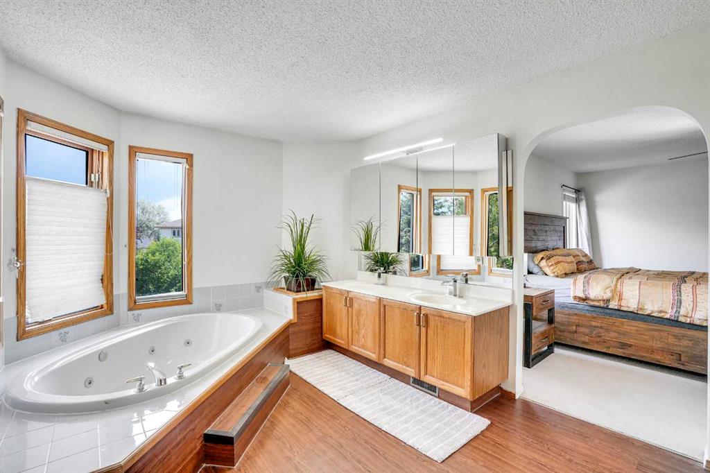 A curved staircase leads to the upper level, where the massive primary suite features a luxurious ensuite with a corner jacuzzi tub, separate shower, vanity, and a huge walk-in closet. Two additional generously sized bedrooms and a full bathroom complete the upper floor.
