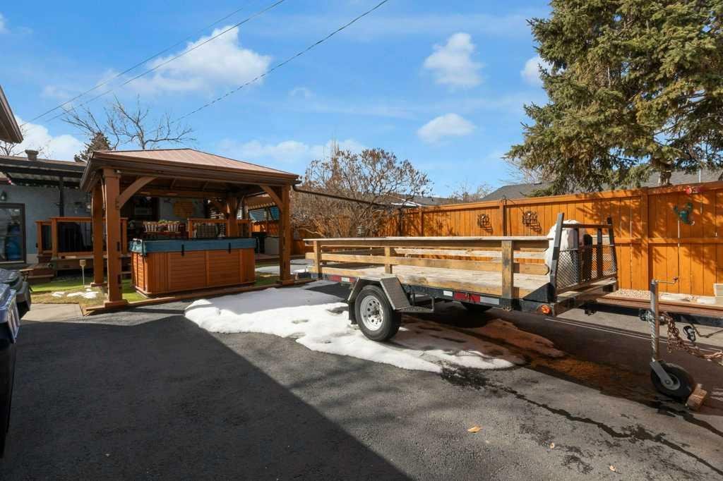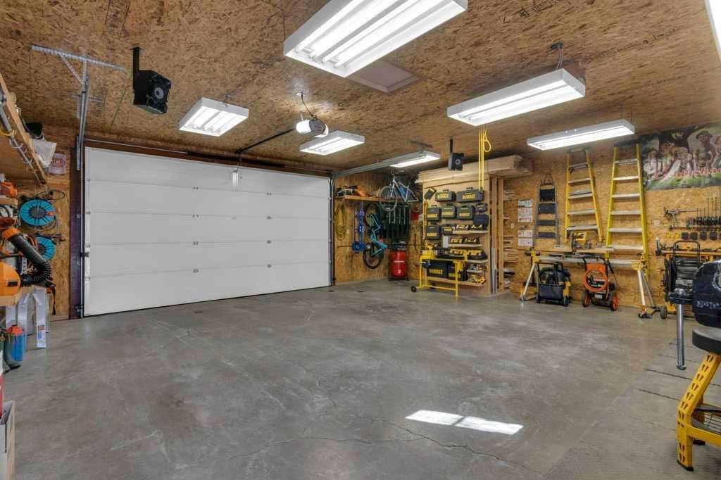 Out back… well, this is where things get extra special. Step through the kitchen’s French doors and into your own backyard escape. Picture summer evenings surrounded by blooming perennials and fragrant lilacs, unwinding on the massive deck with a drink from your live edge bar, soaking in the hot tub, or lounging under the pergola. It’s equal parts garden oasis and entertainer’s playground. The cedar fencing and railings add a timeless, natural charm, while the treated wood accents keep everything looking sharp for years to come. There’s even a cozy fire pit for late-night stories under the stars and a handy wood shed to keep everything stacked and ready. For the hobbyist (or anyone who loves a seriously great garage), the insulated and heated 27′ x 24′ garage is a total dream setup. With paved RV parking and a dedicated RV gate, there’s room for all your toys.
