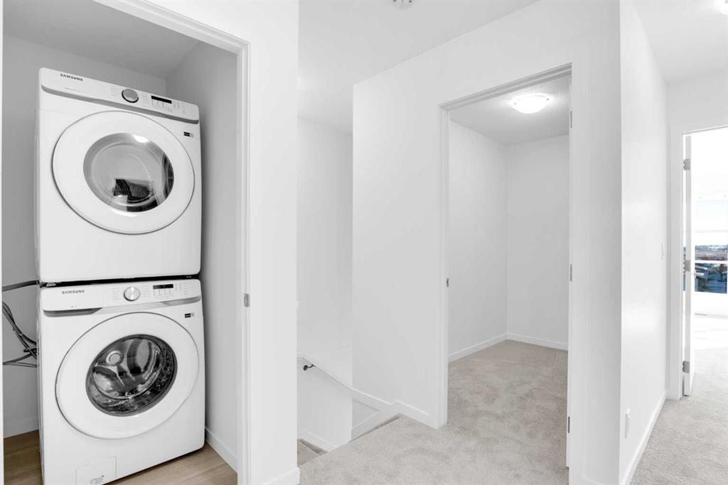 Welcome to this beautifully maintained east-facing No-Condo Fee townhouse offering 3 bedrooms, 2.5 bathrooms, and located in the highly sought-after South Point community in SW Airdrie. Step inside to a bright and welcoming living room with large east-facing windows that fill the space with natural light. The open-concept layout flows seamlessly to the rear kitchen, featuring a central island, extended ceiling-height cabinetry, and stainless steel appliances. Positioned at the back of the home, the kitchen overlooks the backyard and offers direct access, making it both functional and inviting. The main floor is completed by a dining area, a convenient mudroom, and a 2-piece bathroom.