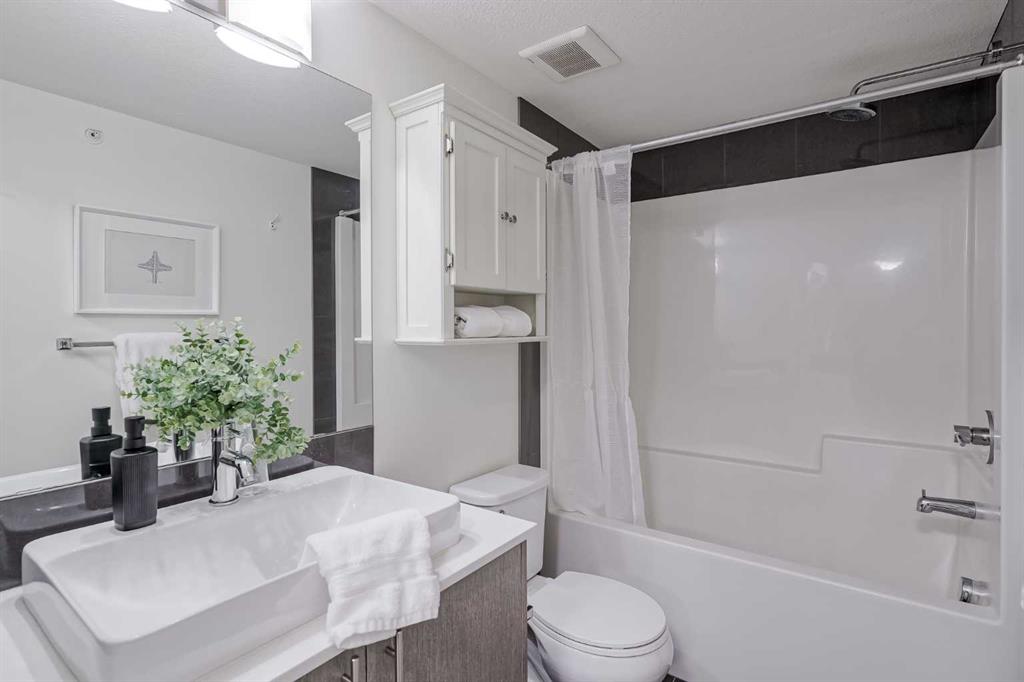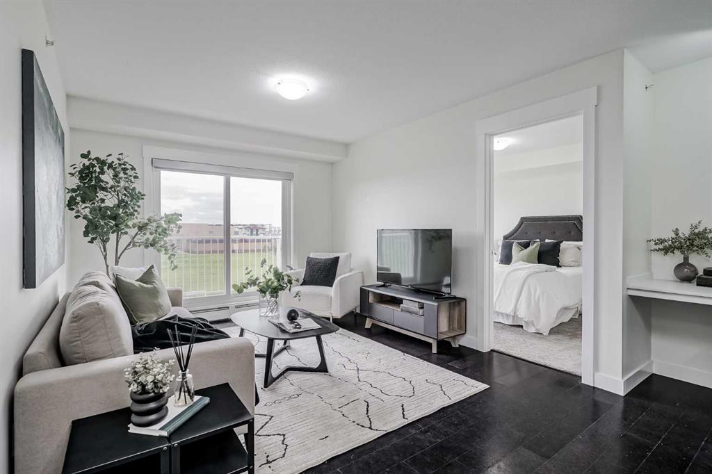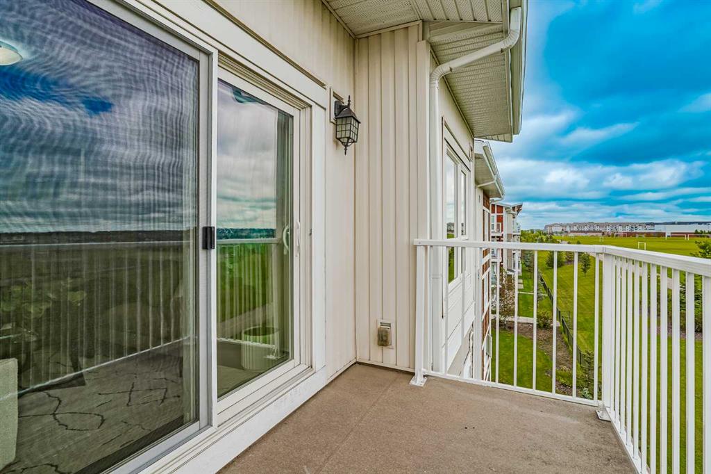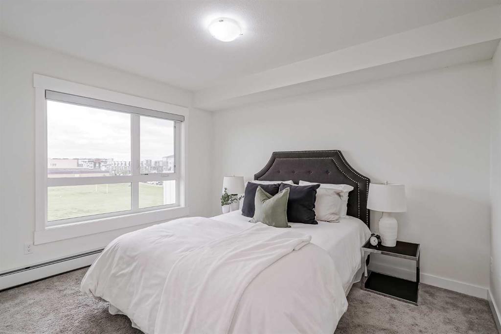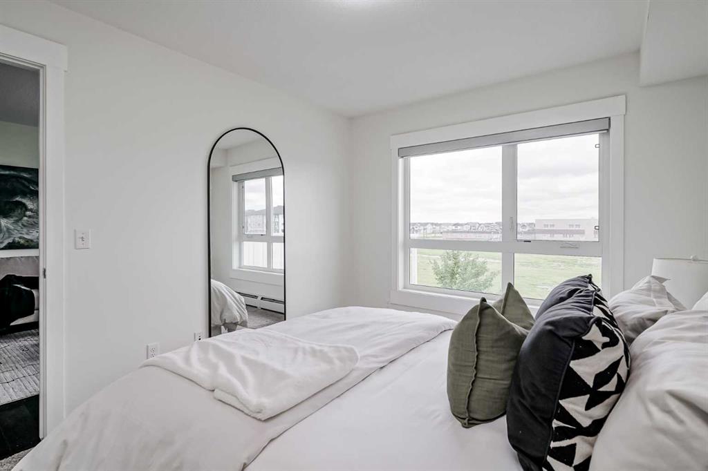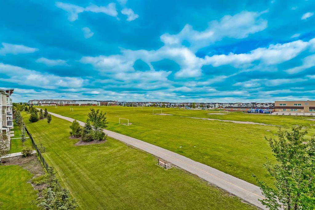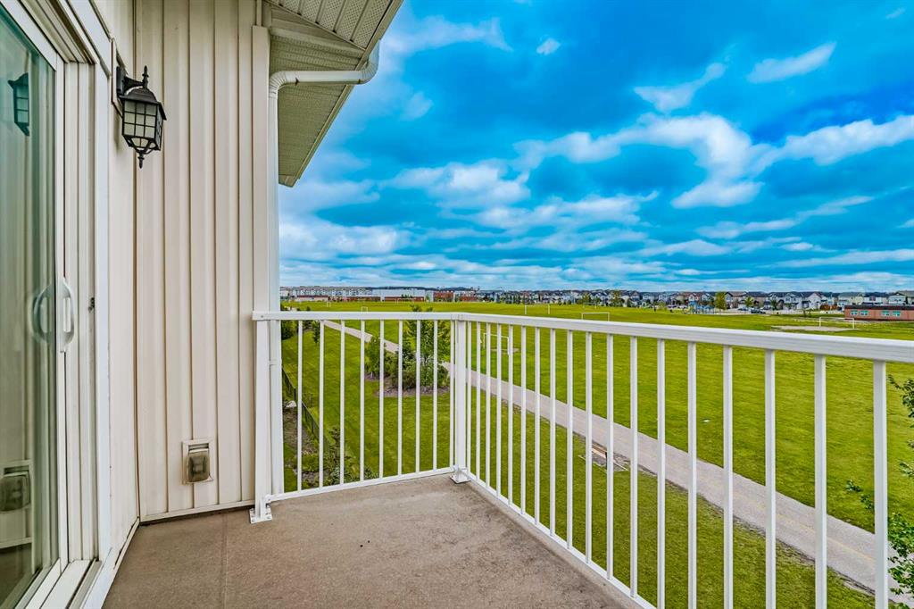 Experience modern living in this stunning top-floor 824 sq. ft. condo with 2 spacious bedrooms, 2 bathrooms and affordable condo fees that include heat and water. Backing onto lush green space, this home offers superior views, tranquility and privacy. The primary bedroom includes a full ensuite for added comfort. Enjoy a bright, airy atmosphere with plenty of natural light in this open concept floor plan, complemented by new zebra blinds in the bedrooms and remote-controlled blinds in the main living area. The sleek kitchen boasts quartz countertops, stainless steel appliances, and under-cabinet lighting. Titled parking and storage provide convenience, while a dedicated laundry room with extra storage enhances functionality. Skyview Ranch is a safe community with many shopping and restaurant options and is conveniently located close to Metis, Deerfoot and Stoney Trails.