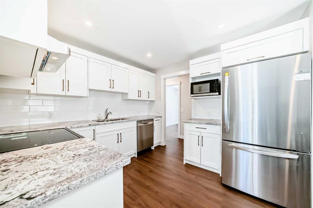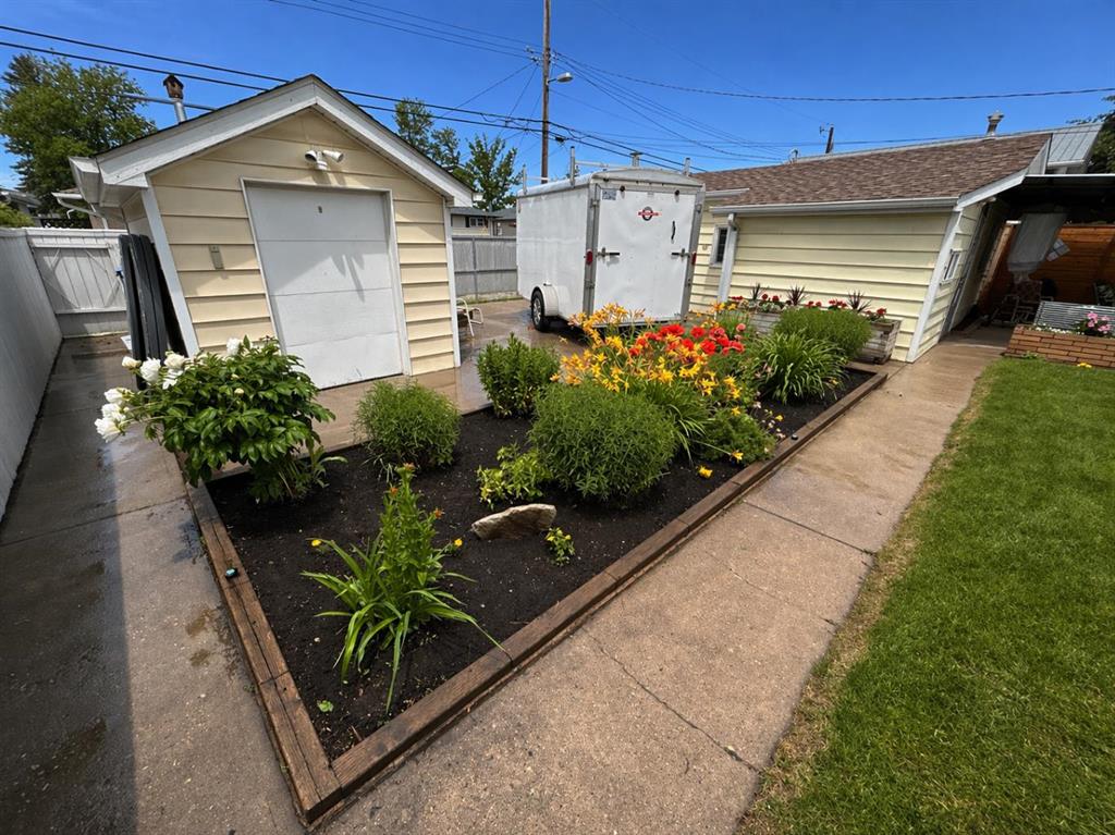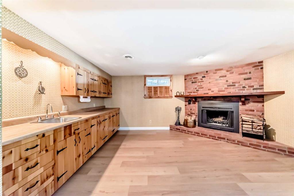 Having just undergone a comprehensive renovation, this spacious bungalow offers over 2,300 square feet of living space and feels remarkably close to a brand new home! With a new kitchen, flooring, lighting, updated wiring and electrical panel, two furnaces, hot water tank, roof shingles, and more, it is truly move-in ready. Proudly owned and enjoyed by the same family for 65 years, this home is ready to welcome its next chapter. The main level features brand new luxury vinyl plank flooring and a bright, stylish eat-in kitchen with crisp white shaker cabinets, granite countertops, and stainless steel appliances. The adjoining flex space has served as a formal dining room for decades but can easily adapt to suit your needs. At the front of the home, the living room is filled with natural light from a large east-facing window, creating the perfect setting to enjoy your morning coffee by the cozy gas fireplace. Three bedrooms complete the main floor, all served by a five-piece bathroom with dual sinks. One of the bedrooms includes a sliding door with access to the composite deck, where you can take in views of the many birds that visit the backyard and relax under the natural gas heater. The lower level offers a generous family room anchored by a charming brick wood-burning fireplace, along with a wet bar or summer kitchen featuring a bar fridge and ample cabinetry. There is also a guest room, a full bathroom, laundry room, and plenty of storage space. Outside, the large west-facing backyard is mature and beautifully maintained, complete with underground irrigation, garden beds, and a covered patio with custom lighting and lush vines – the ideal place to spend summer evenings! The oversized single garage accommodates one vehicle and includes space for tools and a workbench, and the attached, fully finished motorcycle garage offers a secure spot for your prized ride. A large parking pad provides room for RV or trailer storage, and the custom-built tool shed includes an overhead door with electric opener. Located just steps from George Moss Park, you will enjoy access to tennis courts, walking paths, a skate park, pump track, and baseball diamond. The home also offers convenient access to schools, shopping, restaurants, transit, and major roadways. A future Green Line LRT stop planned just a few blocks away adds even more long-term value to this already appealing location. Come see it for yourself, you will not be disappointed!