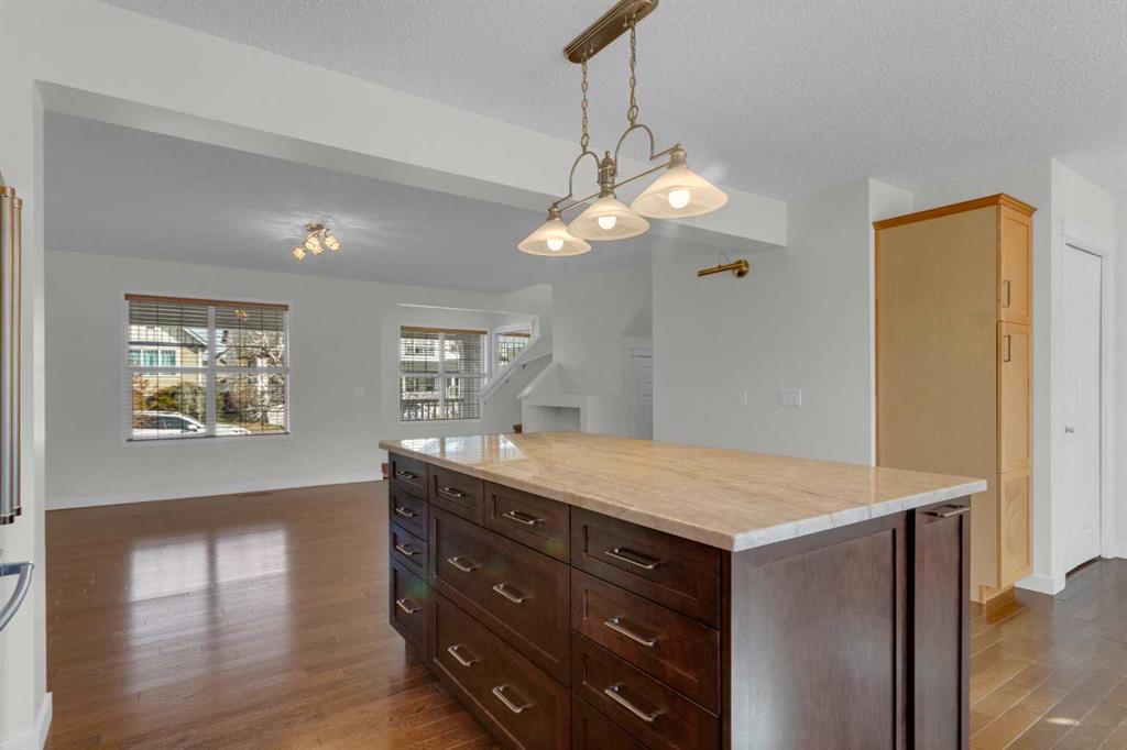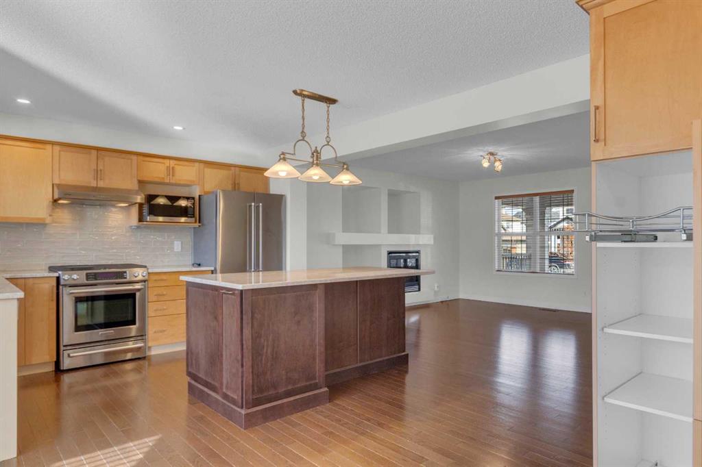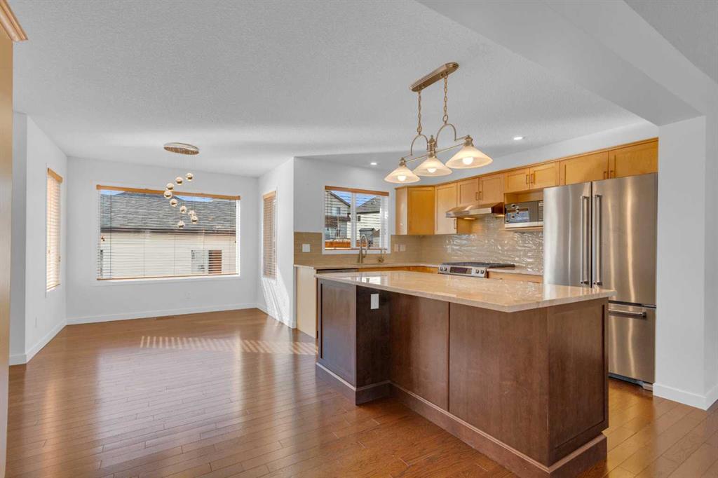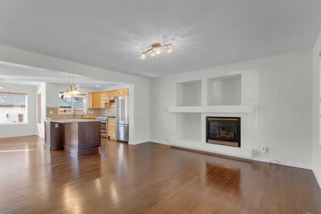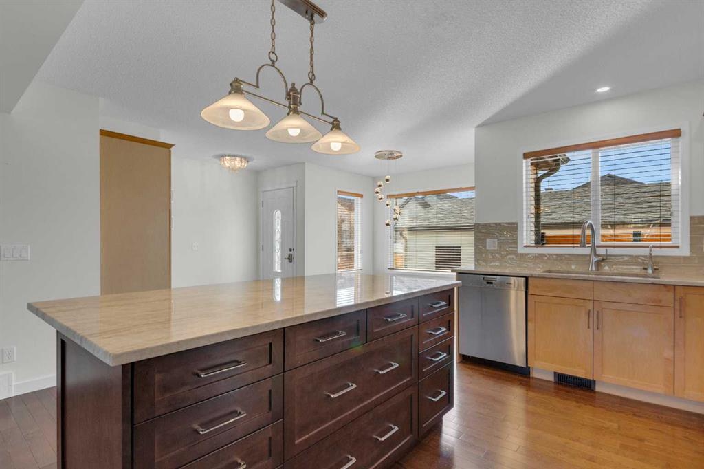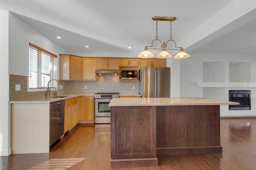 EXTENSIVELY RENOVATED | SOUTH BACKYARD | OVERSIZED GARAGE — this is the one you’ve been waiting for in Copperfield! Ideally located in the family-friendly community of Copperfield on a quiet, tree-lined street where kids can walk to school. Copperfield offers two schools, an active community center with tennis courts, skating rinks, toboggan hills, playgrounds and year-round events, plus you’re just a 4-minute drive to all the amenities of 130th Avenue with quick access to Stoney and Deerfoot Trail. This Jayman-built, energy-efficient home has been extensively renovated with carefully selected, high-quality materials throughout. A massive front porch creates a warm welcome and the perfect place to relax on sunny days. The main floor offers a bright, open-concept layout with a spacious living room featuring a gas fireplace and niche feature wall. The kitchen was fully renovated in 2022 and showcases stunning Taj Mahal (Brazilian) quartzite countertops—known for exceptional density, heat resistance and durability—along with an undermount double sink, updated faucets, In-SinkErator with boiling and filtered water, gas stove, under-cabinet lighting and newer fridge. A large island with abundant storage makes this kitchen as functional as it is beautiful. Hardwood flooring spans both the main and upper levels (also under the staircase carpet). The dining nook overlooks the sunny south-facing backyard. Upstairs you’ll find three generously sized bedrooms, including a spacious primary suite with a large walk-in closet featuring well-designed organizers and a 4-piece ensuite. The main bathroom has been beautifully renovated with tile to the ceiling in the tub surround, tile flooring and striking black fixtures. Both bathrooms include newer Toto toilets. The undeveloped basement offers excellent future potential with utilities thoughtfully tucked away and rough-ins for a 3-piece bathroom. Additional upgrades include a hot water tank (2 years old), Lennox air conditioning, and a water softener. The south-facing backyard is low maintenance and features a large deck with privacy walls, dog run —perfect for outdoor living. The oversized garage measures 24′ x 22′. Additional updates include a new rear exterior door, updated front and rear screen doors, and in 2022, new Class 4 hail-resistant shingles and new vinyl siding. This is a beautifully upgraded home with nothing left to do but move in and enjoy!