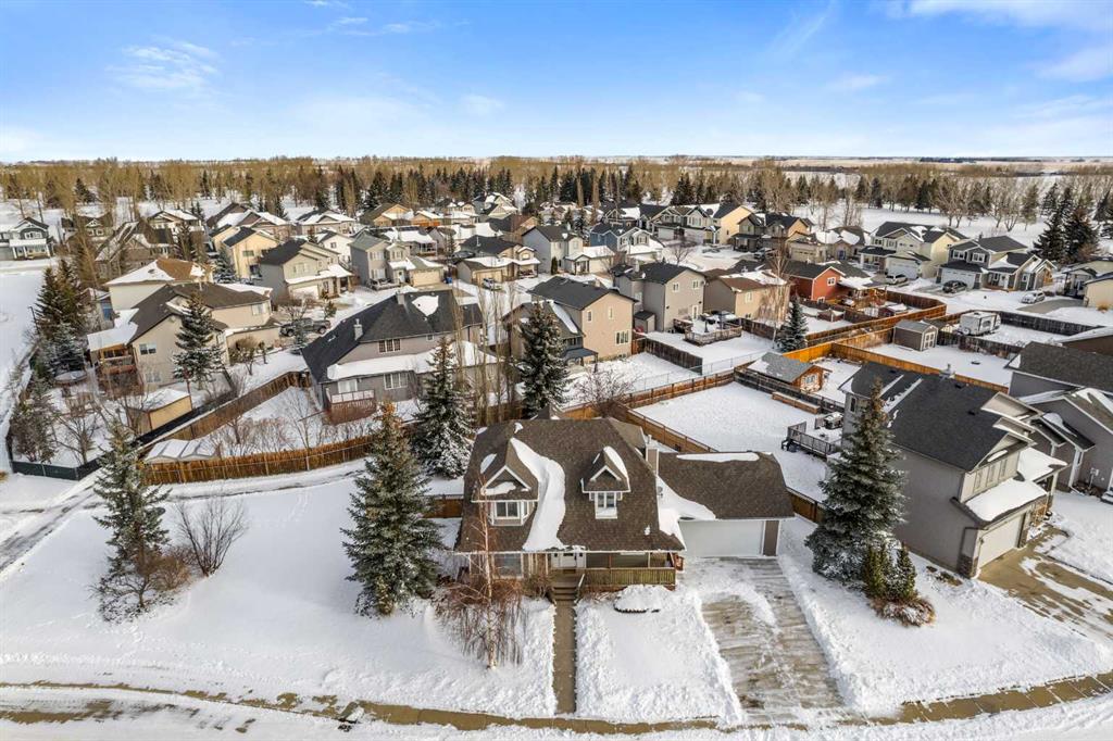 This Carstairs home was originally built as a show home and offers a thoughtful layout with tons of built in features, on a 0.35-acre lot bordered by mature trees. You will love the south facing covered front porch, no neighbors beside overlooking the beautiful GREENSPACE. Appreciate the FENCED YARD + covered rear DECK & PATIO area creating a PRIVATE SETTING that feels tucked away while still being part of a welcoming neighborhood. Built in 2002, the home is flooded with NATURAL SUNLIGHT & has been refreshed with 2026 updates to flooring, paint, light fixtures on the main and upper levels, & Furnace in 2025 giving it a clean, comfortable feel. The main floor flows easily from the kitchen—finished with attractive cabinetry & numerous built in features—into a flexible dining or office space, and then into the living room where a double sided GAS FIREPLACE adds warmth and character. Upstairs, the primary bedroom is set apart with a walk-in closet and 3-PIECE ENSUITE, while two additional bedrooms and a 4-piece bath make the upper level practical and well balanced. Downstairs, you will find large windows bring natural light into the family and hobby room, offering space to relax, create, or gather, with rough-ins for a bathroom and wet bar. The backyard has easy access from the DOUBLE ATTACHED GARAGE, complimented by an extended driveway for vehicles & toys. Set in a family-friendly area of Carstairs, with walking paths nearby and the golf course just minutes away, this is a home that offers space, privacy, and a comfortable pace of living.