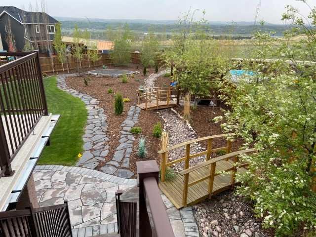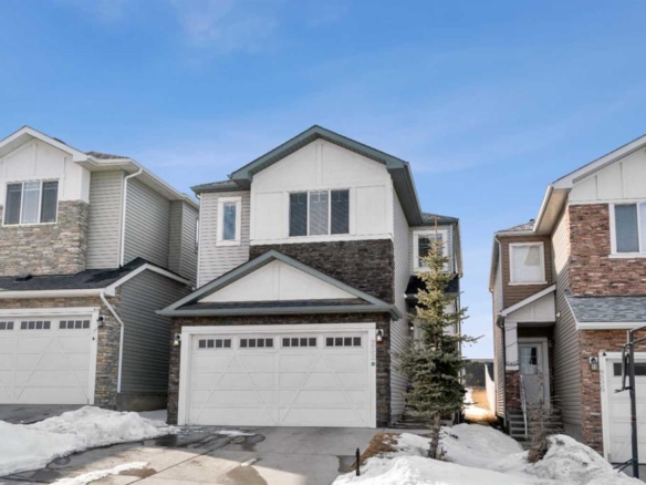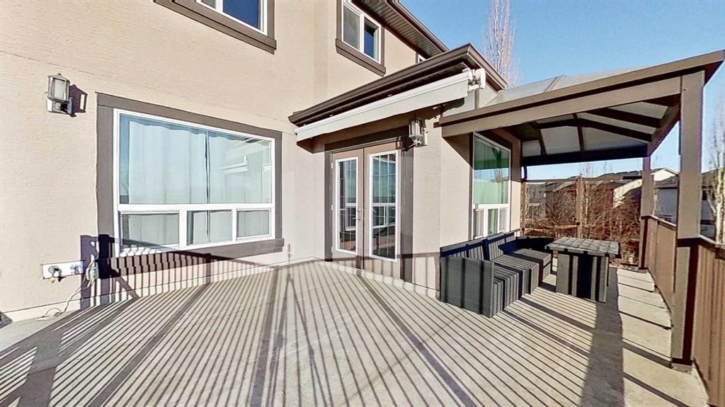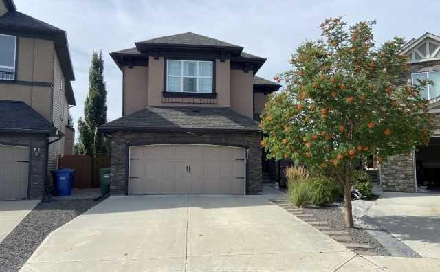 Exceptional home on one of the largest lots in Cranston, offering a rare pie-shaped, south-facing, professionally landscaped backyard on a quiet cul-de-sac. The outdoor space is truly unique, featuring a covered upper deck with awning, stone stairs leading to a gated backyard exit, a pergola, and two charming bridges connecting the yard-perfect for relaxing or entertaining. A fully developed walkout basement completes the seamless indoor–outdoor living experience. The open-concept main floor showcases a striking floor-to-ceiling tiled electric fireplace, a dedicated main-floor office, and a convenient walk-through pantry, ideal for modern living. Upstairs, the spacious primary retreat includes a luxurious ensuite with his-and-hers sinks, a vanity area, a walk-in closet, and a private coffee bar. A large bonus room, two oversized bedrooms-each with walk-in closets, and a generous laundry room complete the upper level. The walkout basement offers outstanding versatility with two additional bedrooms, a full bathroom (10 mm glass shower) with heated tile floors, a large living area, and a wet bar with heated tile flooring, all with direct access to the backyard. Located in the highly sought-after community of Cranston, known for its family-friendly atmosphere, excellent schools, parks and pathway systems, proximity to Fish Creek Park and the Bow River, and easy access to Seton Urban District, South Health Campus, and major commuter routes (3 min walk to the bus stop).