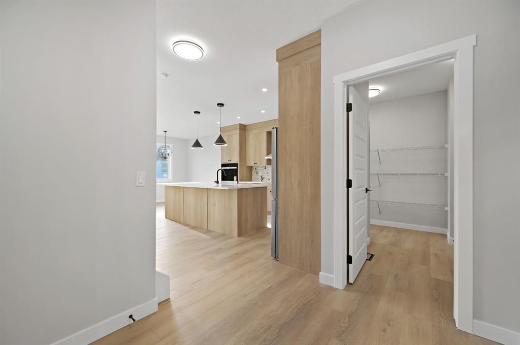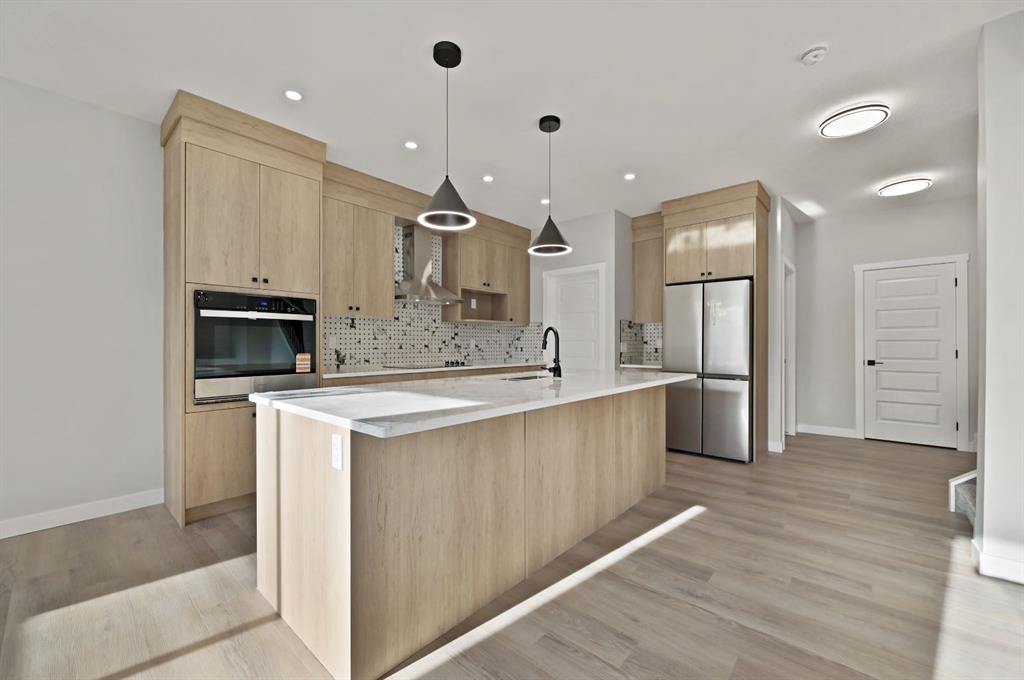 Step inside to an open-concept main floor showcasing a chef-inspired kitchen complete with a large island, quartz countertops, built-in wall oven, electric cooktop, stylish range hood, and a convenient walk-through pantry. The dining area is illuminated by an elegant LED chandelier and flows seamlessly into the spacious living room, highlighted by a white feature wall and designer-style electric fireplace — perfect for entertaining or relaxing.