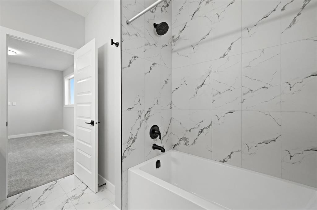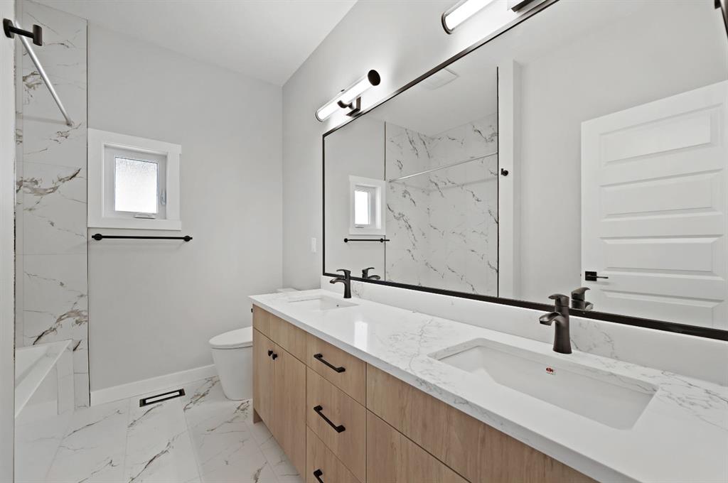 The main floor is finished with sleek black Moen fixtures, LED lighting throughout, and a chic half bath. Upstairs, enjoy a bright bonus room and three spacious bedrooms, including a luxurious primary suite with a 4-piece ensuite. The additional full bath features Jack & Jill sinks and quartz counters, making it ideal for families. Convenient upper-level laundry adds to the thoughtful layout.