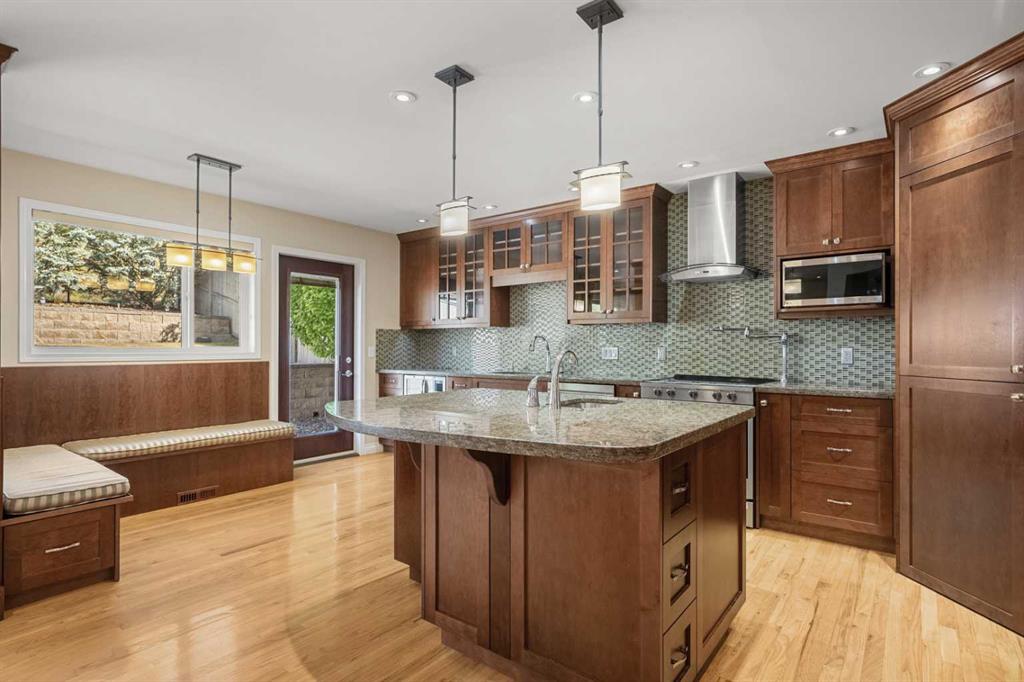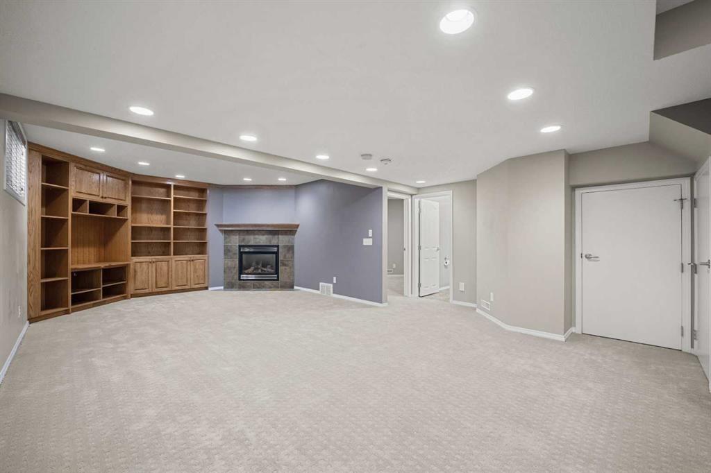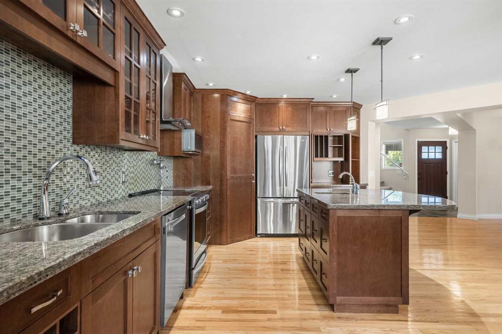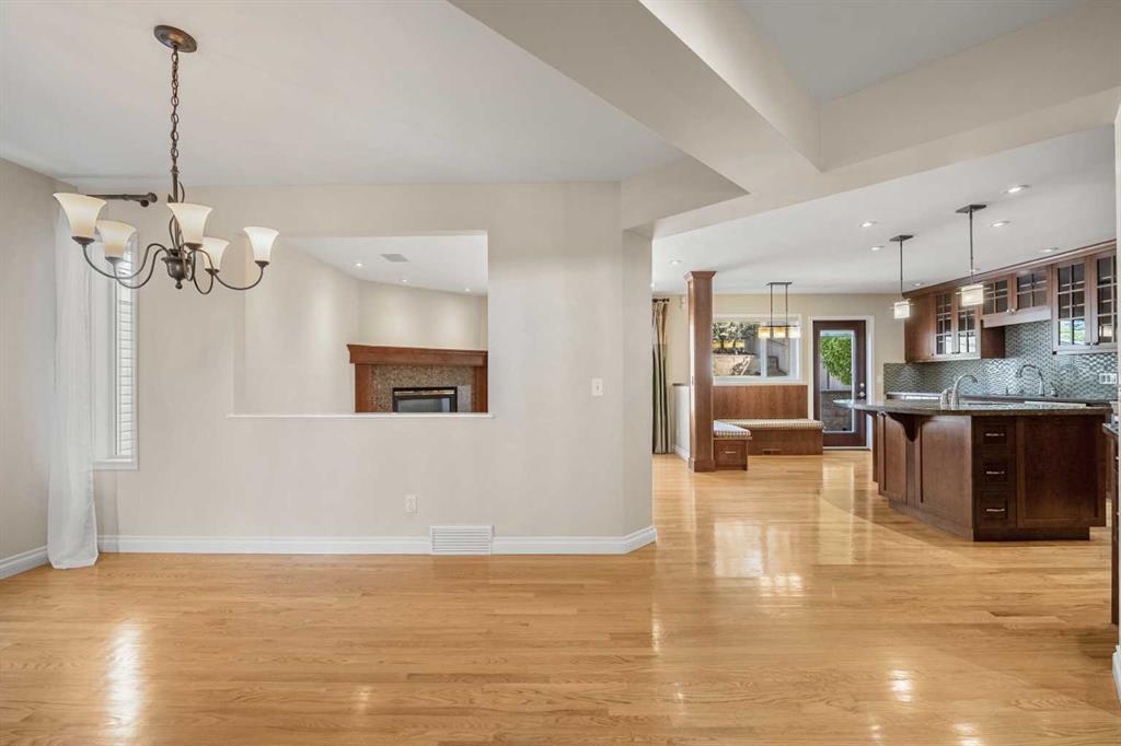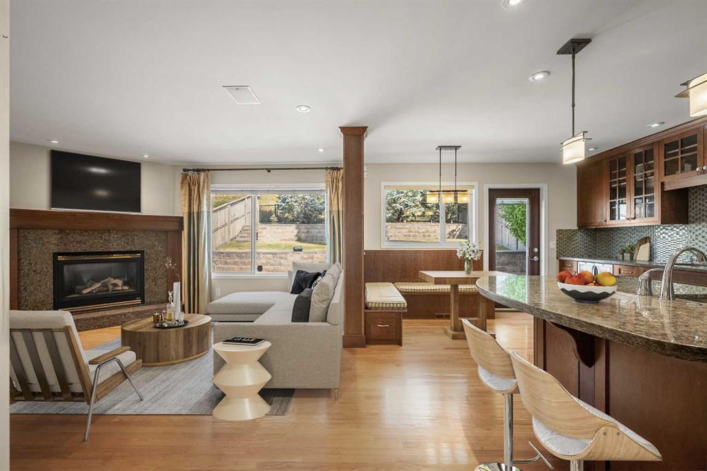 *** $30,000 PRICE IMPROVEMENT!!! *** Exuding timeless elegance and modern refinement, this meticulously renovated Jayman-built residence in the prestigious community of Springbank Hill offers over 2,600 sq.ft. of beautifully curated living space with 4 bedrooms and 3.5 baths. A custom front door opens to a welcoming tiled foyer, where hardwood floors set the tone for the home’s luxurious interiors. To one side, a formal dining room flows seamlessly into a spacious living area, anchored by a granite-surround gas fireplace with bespoke wood mantle. The showpiece of the main floor is the exquisitely updated chef’s kitchen, showcasing full-height custom cabinetry, a built-in wine fridge and rack, coffee bar, spice drawers, sheet pan storage, Delta touch faucet, electric range stove with pot filler, and a thoughtfully expanded corner pantry with maximized shelving. A large kitchen island with secondary vegetable sink provides additional storage and seating, while the built-in banquette (with pull out storage) breakfast nook adds charm and functionality. Tucked discreetly away is a built-in office space with folding doors, alongside hidden bins for compost, garbage, and recycling. From here, step outside to the professionally landscaped backyard featuring stonework, retaining walls, a gas line for BBQs, with direct access to a scenic walking path. A powder room, laundry room, and extra storage complete the main floor. Upstairs, a sun-drenched south-facing bonus room, with custom wooden shutters, offers the perfect retreat for family movie nights. Two secondary bedrooms with custom built-in closets and wooden shutters share a newly renovated bathroom with heated floors, expanded counter space, and abundant storage. The tranquil primary suite overlooks the manicured yard and boasts a walk-in California Closet, wooden shutters, and a spa-inspired ensuite with heated floors, an oversized glass shower, standalone tub, and custom vanity storage. The fully finished basement is brightened by expanded windows and features a spacious games area, a second family room with fireplace, a large guest bedroom with egress window, and a full bath. Even the under-stair storage is finished and lit, doubling as the perfect children’s hideaway or play space. Additional highlights include Hunter Douglas blinds, designer Hubbardton Forge lighting, built-in vacuum, Kinetico water softener, humidifier, and central A/C. Recent updates ensure peace of mind, including a newer hot water tank (2018), dishwasher (2021), washer/dryer (2019), and NO Poly-B plumbing. This is an exceptional opportunity to own a fully upgraded, move-in ready home in one of Calgary’s most coveted communities!