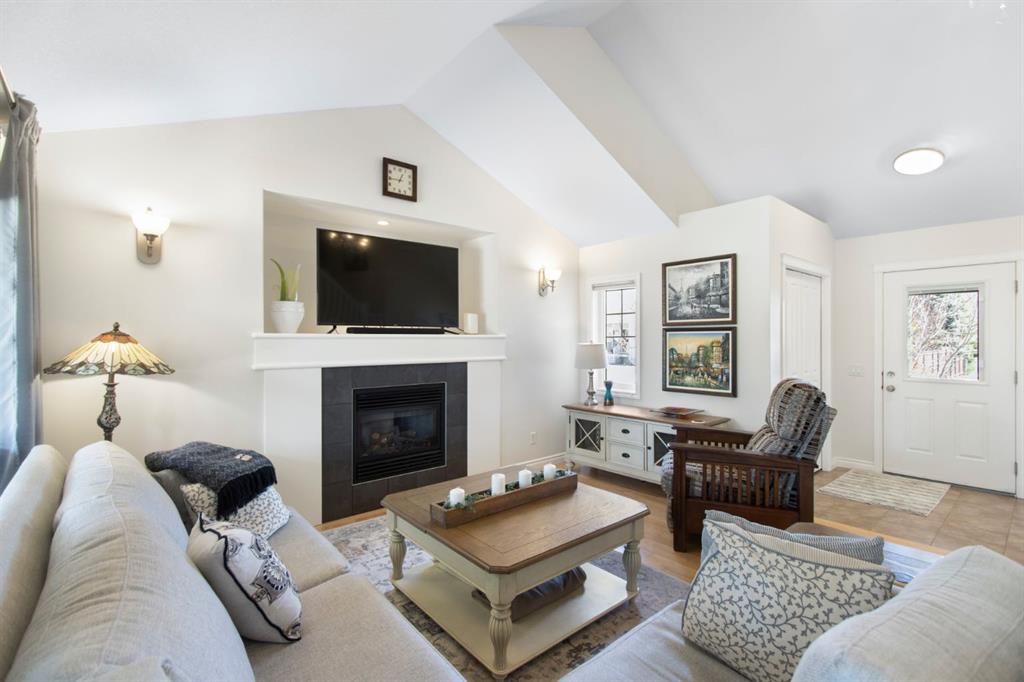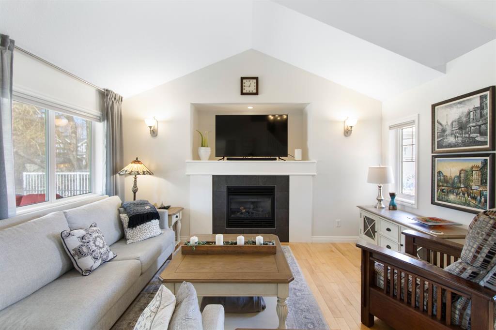 This home shows a “10 out of 10″ and offers nearly 1,700 sq. ft. of pristine, move-in-ready living space. The inviting entry opens into a bright living room featuring hardwood floors, soaring vaulted ceilings, a cozy gas fireplace, and large windows that frame views of the west-facing backyard. The seamless open layout leads to a gourmet kitchen equipped with white shaker-style cabinetry to the ceiling, granite countertops, a large island, a gas stove, and stainless steel appliances. Also on the main level, a functional laundry/pantry room, a 2-piece bathroom, and direct access to a private, covered back deck and the back yard surrounded by mature trees.