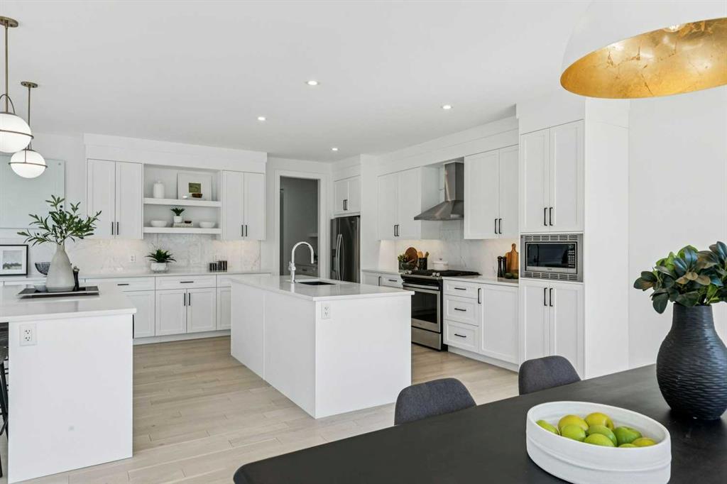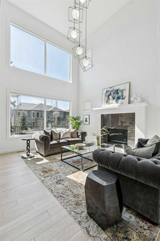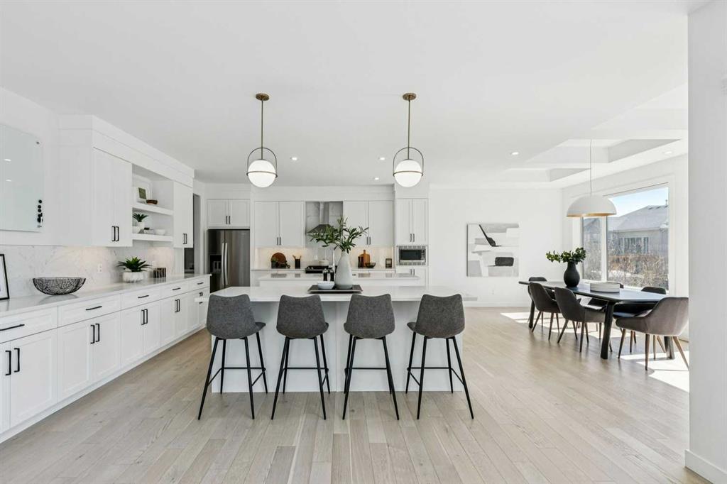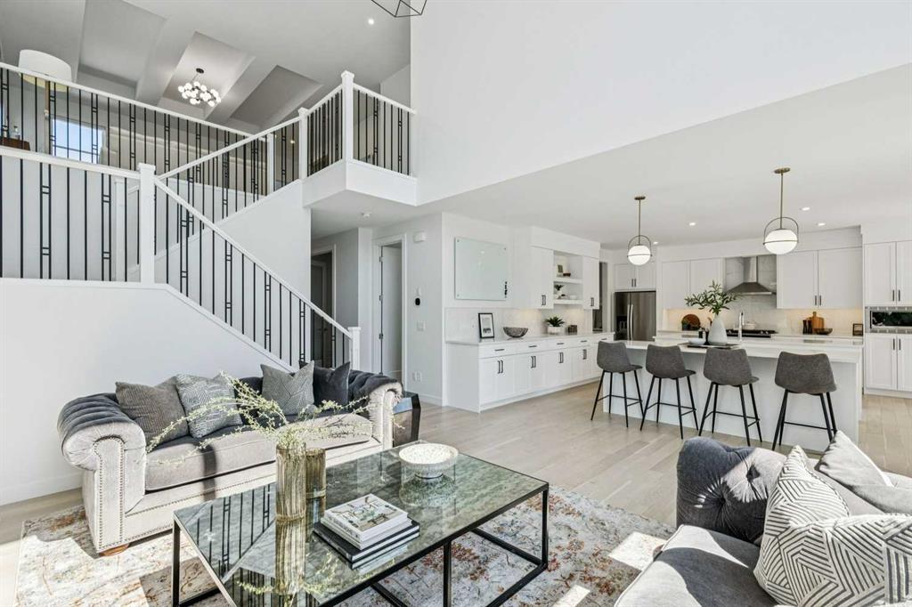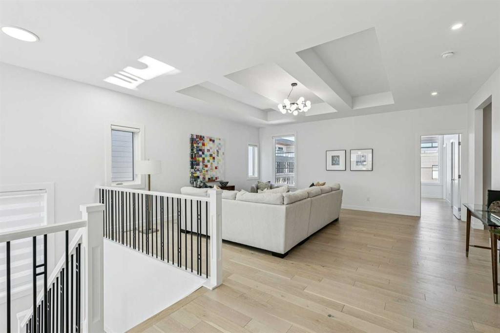 A RARE FIND! Why build new when you can save the GST & a year of construction? This beautifully maintained & thoughtfully upgraded family home, built by Truman Homes, sits on a premium south facing mature lot in the heart of the highly sought-after West District. The Pulsar II offers 3,240 sq. ft. above grade & a total of 4,380 sq. ft. of developed living space, including the fully finished walk-out lower level. Designed with an open concept layout, featuring soaring two storey vaulted tray ceilings, 8’ custom doors & 9’ ceilings on every level. A dramatic wall of windows across the back of the home, combined with the sunny south exposure, fills the main floor with natural light throughout the day. The elegant great room showcases a gas fireplace with marble tile surround, while the adjoining chef’s kitchen is truly exceptional. Highlights include oversized double islands, 4 stool breakfast bar, extensive double height cabinetry, abundant soft close pull-out drawers, premium quartz countertops & upgraded stainless steel appliances, including a 5-burner gas range. A fully equipped walk-through butler’s pantry provides additional storage for food & small appliances. The expansive 20’ x 10’ dining area is ideal for entertaining & family gatherings, with sliding doors leading to an oversized deck overlooking the fully landscaped yard & custom children’s play area. A main floor office with French glass doors & private two-piece bath completes this level. Upstairs, you’ll find a central bonus room, two spacious secondary bedrooms – each with its own walk in closets & ensuite bathrooms, & a luxurious primary suite retreat. The primary bedroom features dual walk-in closets & spa-inspired five-piece ensuite with marble flooring & wall accents, freestanding soaker tub, raised dual vanities & an enclosed 5’ shower. The professionally finished walk-out lower level, completed by the builder, offers approximately 1,150 sq. ft. of additional living space with a separate entrance. It includes a large recreation area, 4th bedroom, 4-piece bathroom, a 2nd full laundry & ample storage. Large windows provide plenty of natural light & direct access to the patio. A wonderful space for teenagers, extended family or visitors. Over $190,000 in upgrades enhance the home, including separate heating zones for each level, 2 high-efficiency furnaces, central air conditioning, premium hardwood flooring, flat ceilings & custom California Closets. The triple garage features high ceilings, offering the potential for a car lift. Located in one of Calgary’s premier master-planned communities, this home offers exceptional walkability—just steps to shops, restaurants, schools, parks & pathways. Enjoy a short commute to downtown & nearby hospitals, with easy access to Stoney Trail & just 45 minutes to Kananaskis. Lovingly built & meticulously maintained, this home presents a rare opportunity to own a nearly new custom estate property in West Calgary.
