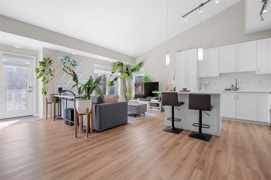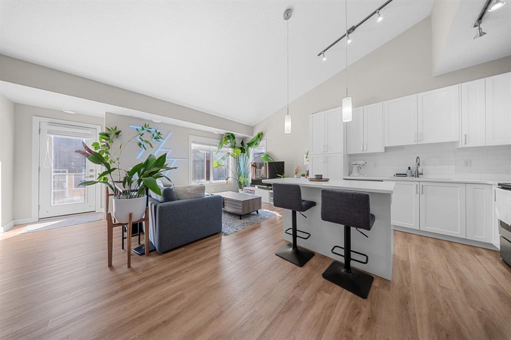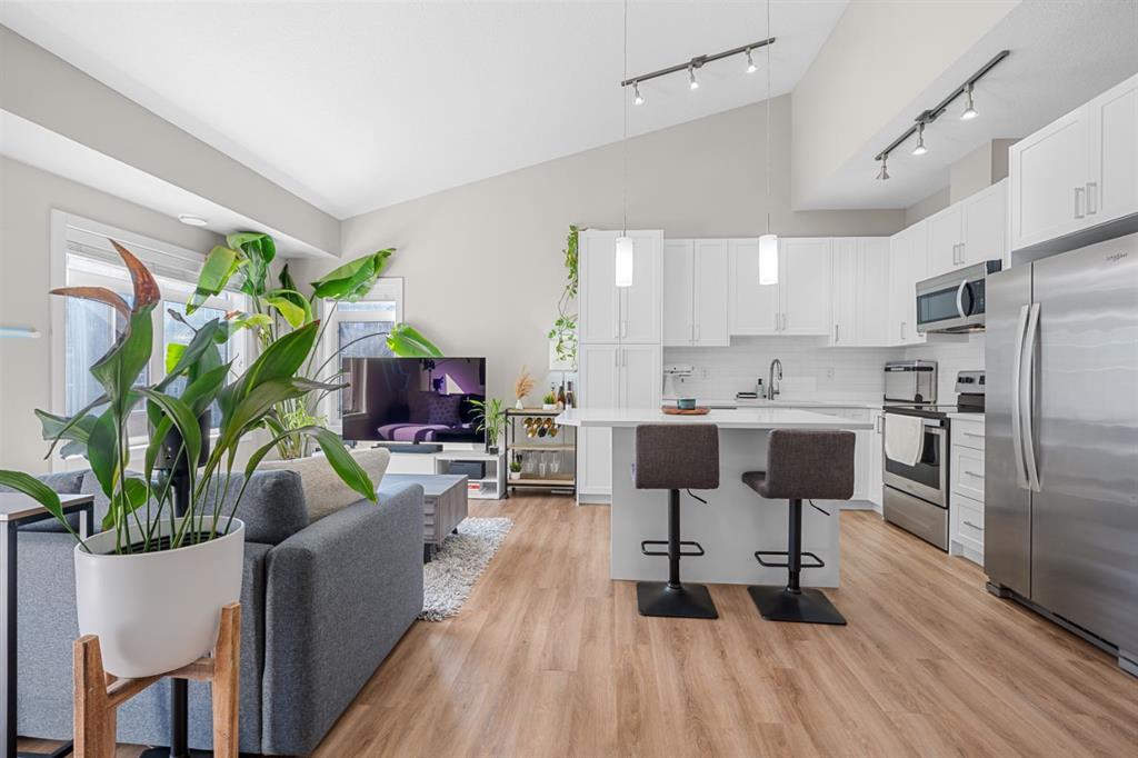The main floor greets you with soaring VAULTED ceilings, creating an expansive, airy feel that enhances both space and light. As a TOP FLOOR corner unit, it offers true loft inspired design, and the rare combination of end unit positioning, top floor privacy, and SOUTH facing exposure bathes the home in natural light throughout the year. The kitchen features beautiful stainless steel appliances, a large CENTRE ISLAND ideal for gatherings, stunning QUARTZ countertops, and elegant cabinetry that ties the space together seamlessly. The primary bedroom offers a WALK-IN closet along with a comfortable space to unwind. The second bedroom is well suited for guests or a home office. Step outside onto the sun bathed, spacious balcony, thoughtfully curated for morning coffee or an evening beverage, with views of the professionally landscaped central courtyard. On the same floor, you’ll find an ELEGANT 4-piece bath along with stacked laundry. The ATTACHED GARAGE adds everyday convenience with direct access to your vehicle and additional STORAGE space under the stairs. Ideal for first time home buyers or downsizers, enjoy LOW CONDO FEES and a well managed complex. Book a showing with your favourite agent today!