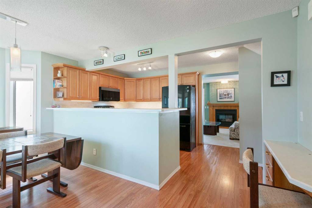 One of the few units backing directly onto green space, the home features a private west-facing backyard, perfect for unwinding in the evening. The main floor showcases a bright, upgraded kitchen with a sunny breakfast nook, opening seamlessly to a spacious living room with a cozy gas fireplace. Patio doors lead to a deck ideal for relaxing or entertaining. A convenient two-piece bathroom completes the main level.