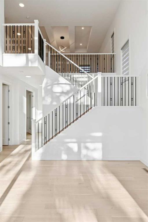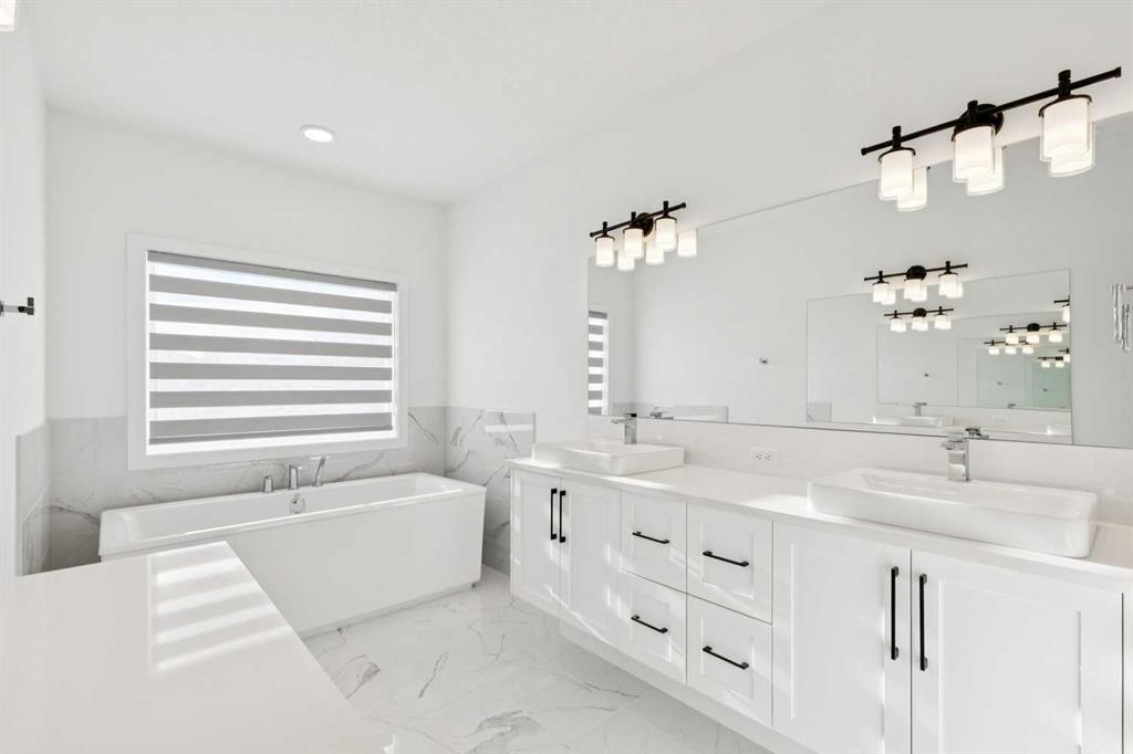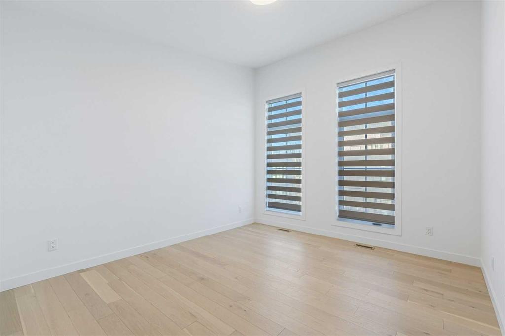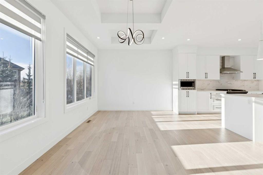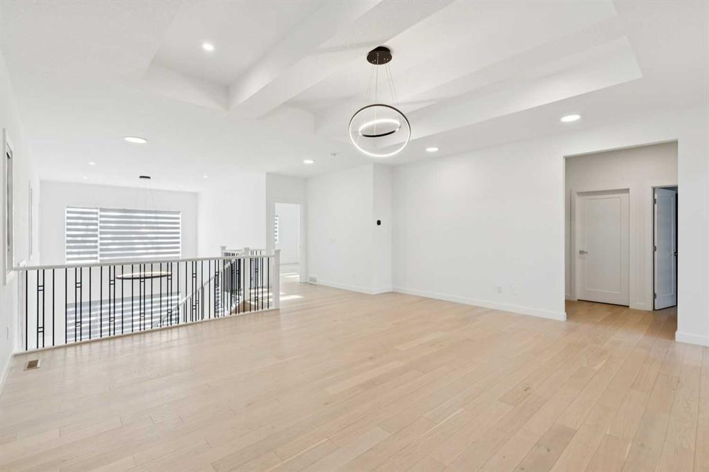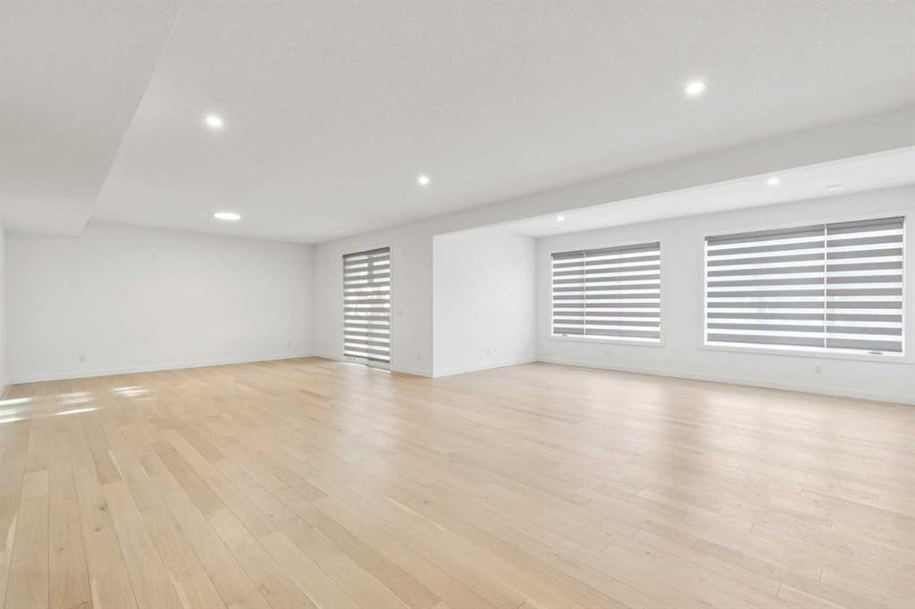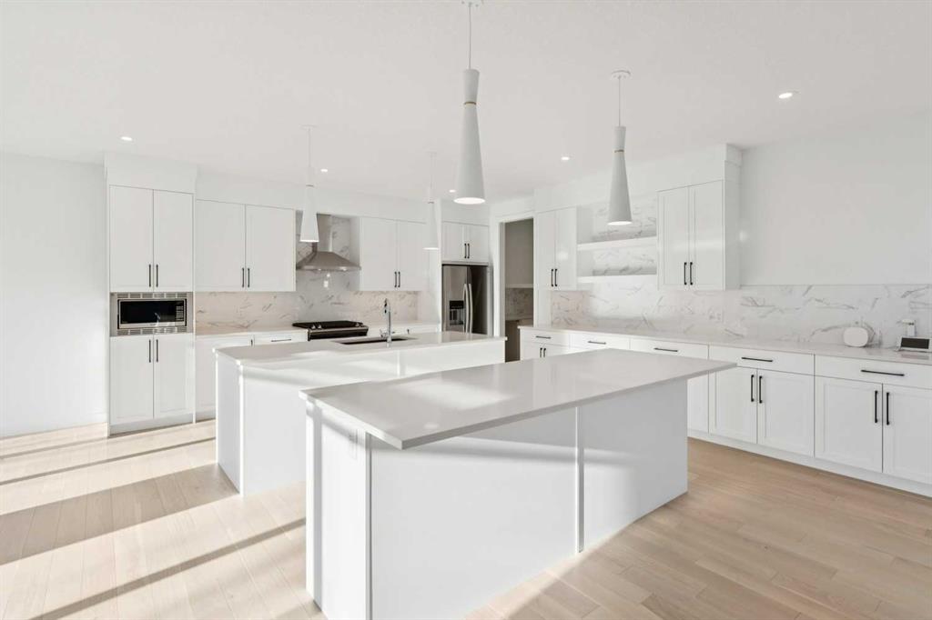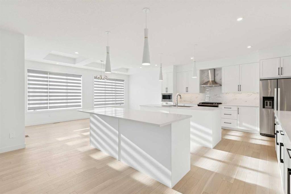 A RARE FIND! Why buy new? Save the GST and a year off construction. Chose your possession date & move in to enjoy your exceptional new home. Custom built by Truman, this barely lived-in stunning home is located on a premium south-facing, mature lot in the heart of highly sought-after West District. Offering over 4,380 sq. ft. of luxurious open concept living space, including a fully developed walk-out lower level. The Pulsar II features soaring two-storey vaulted tray ceilings, 8’ doors throughout the main floor, a dramatic wall of windows spanning the back of the home, upgraded 9’ ceilings on every level, walk-in closets & an ensuite attached to every bedroom! From the moment you step into the formal entry, you’ll appreciate the abundance of natural light that flows through the home. The elegant great room features a gas fireplace beautifully finished with tile. The adjoining chef’s kitchen is truly exceptional, featuring oversized double islands, table-top breakfast bar, extensive double-height cabinetry with soft-close pull-outs, stunning upgraded quartz countertops, premium lighting & plumbing fixtures, top-of-the-line stainless steel appliances including a 5-burner gas range. A beautifully finished walk-through butler’s pantry provides additional storage. The expansive 20’ x 10’ dining area is perfect for entertaining & large family gatherings, with a garden door leading to the full-size deck, overlooking the sunny, fenced yard. Main floor office with French glass doors & private ½ bath complete the main. The upper level offers a central bonus room & 2 spacious bedrooms, plus, the primary suite is a true retreat! Features his/hers walk-in closets, luxurious 5-piece spa-inspired ensuite with marble flooring & wall accents, freestanding soaker tub, raised dual vanities & enclosed 5’ shower. The professionally finished walk-out lower level, completed by the builder, has a separate entrance with potential for conversion to a full suite. Approximately 1,150 sq. ft. of additional living space & features a massive open recreation area, perfect for entertaining, a spacious 4th bedroom, a 4-piece bathroom & ample storage. Large picture windows overlook the yard, with direct access to the patio. Additional $100,000+ of custom upgrades include separate heating zones for every level, 2 HE furnaces, central air conditioning, premium hardwood flooring. Wonderful triple garage with high ceilings allowing for addition of a car lift. Representing the pinnacle of master-planned neighbourhoods, enjoy the walkability, just steps from shops, restaurants, schools, parks & pathways. Enjoy a short commute to both hospitals & downtown, with easy access to Stoney Trail, just 45 minutes to Kananaskis. Top ranked school district, both public & private from K to Grade 12. Lovingly built and rarely occupied by a single professional who travelled extensively, this home offers a rare opportunity to own a nearly new, custom estate property. Unbeatable hidden gem in West Calgary!