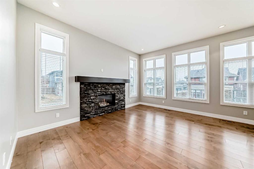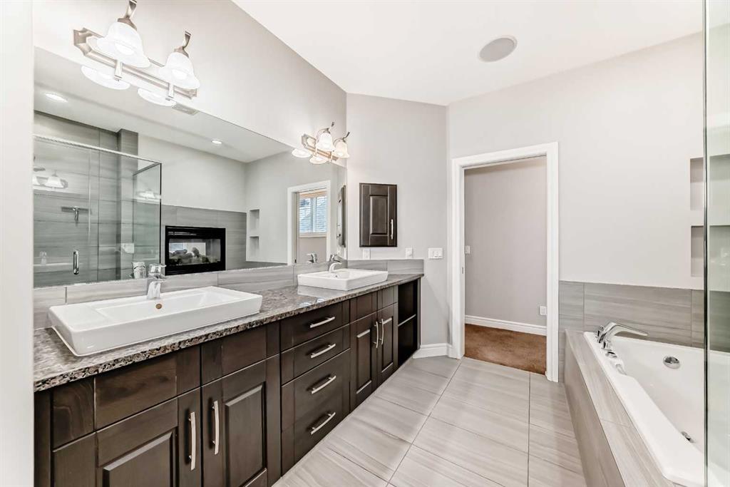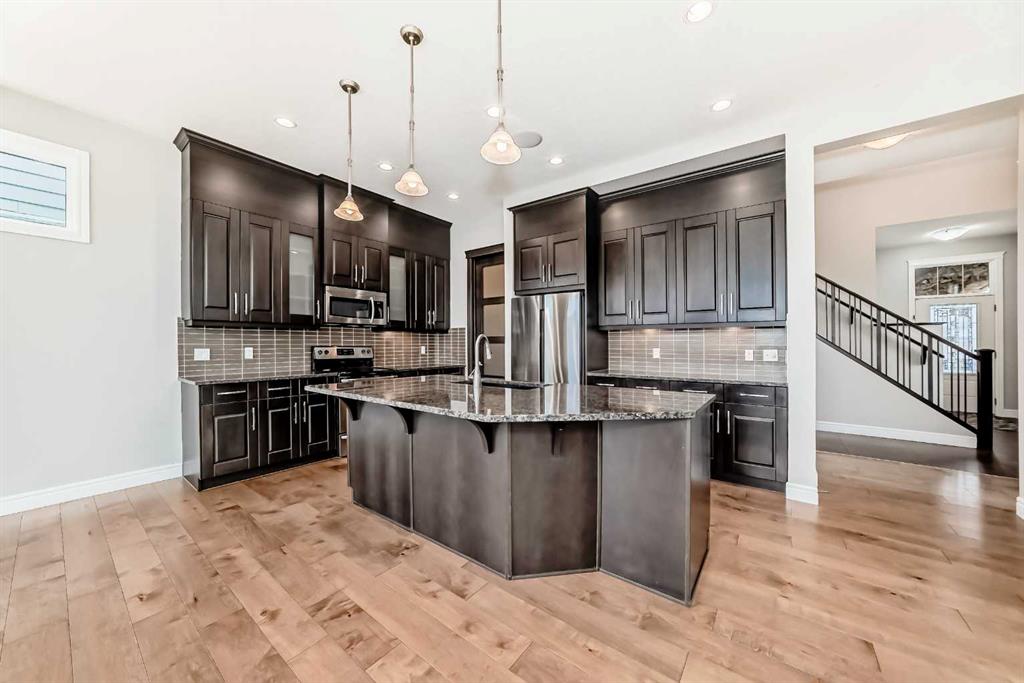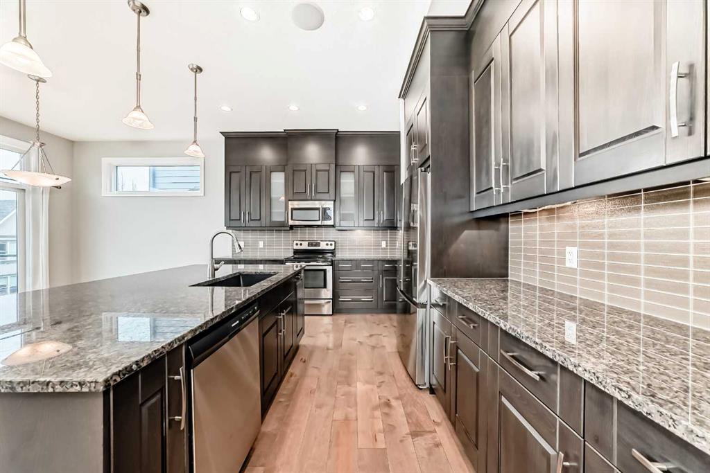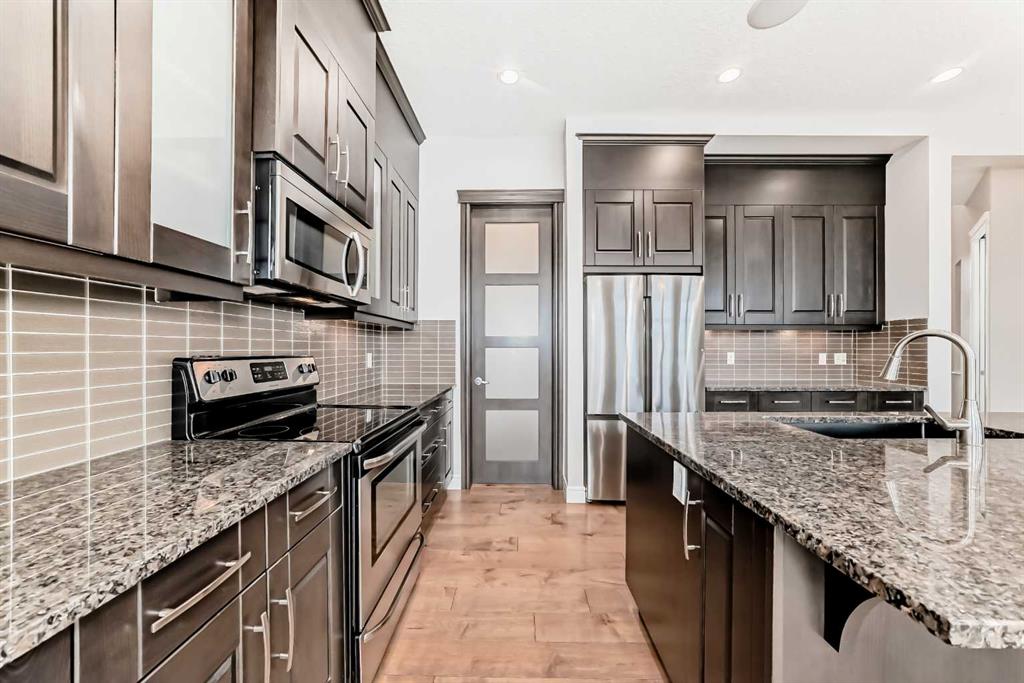Welcome to this stunning luxury residence on a large corner lot just steps from the Mahogany Beach Club in Calgary’s premier lake community. This executive home makes a grand first impression with 10-foot ceilings, 8-foot doors, and a refined mix of ceramic tile and hardwood flooring. The main level offers a dedicated home office and an open-concept living space where floor-to-ceiling cabinetry and granite countertops meet a cozy gas fireplace.
