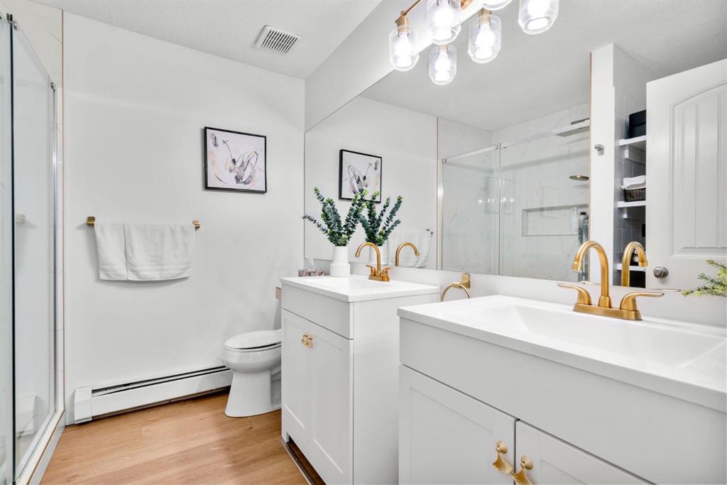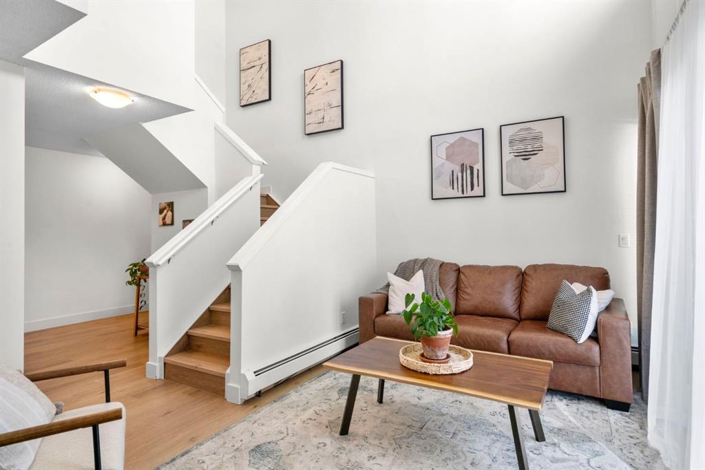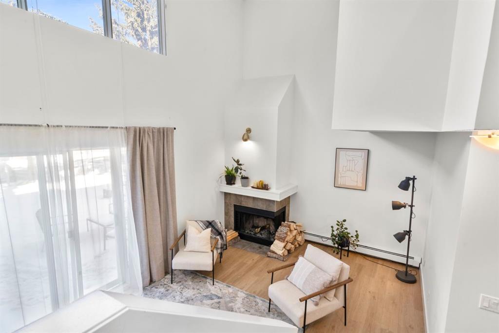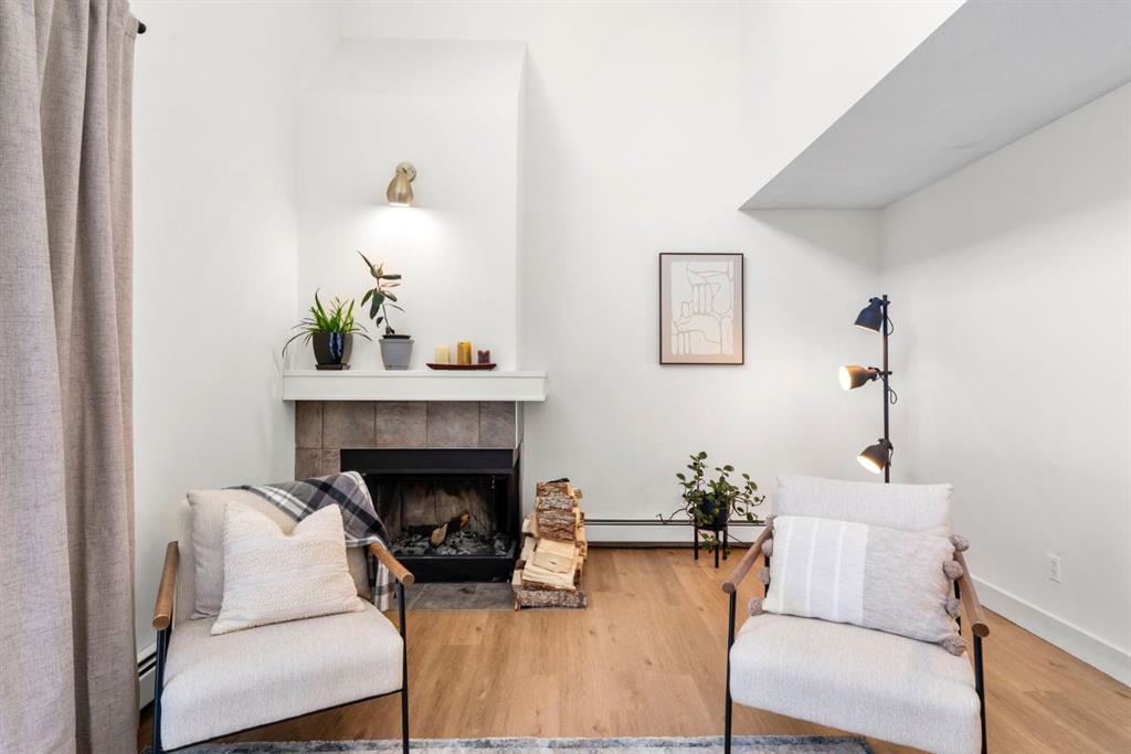 Welcome to this beautifully updated loft-style condo in The News from Broadcast Hill located in Patterson – a mature, desirable west-side neighbourhood known for it’s quiet streets, extensive pathways and convenient access to downtown. Offering over 1,000 sq. ft. of living space, this 2-bedroom, 1.5-bathroom home features a bright and airy layout with soaring high ceilings and large windows that fill the space with natural light. Fresh, modern updates make this unit completely move-in ready: the entire home was professionally painted in 2022, new vinyl flooring was installed throughout in 2022, and the main bathroom was fully renovated in 2023. As you step inside, you’ll find a convenient powder room and in-suite laundry, with the kitchen down the hallway on the right. Bright and inviting, it features granite countertops with plenty of counter space and cabinets, a newer Bosch dishwasher, a window over the sink, a pantry and a peninsula with seating — great for casual dining. The adjacent dining area opens onto a spacious east-facing patio surrounded by mature trees with downtown views, offering beautiful morning sunlight and a peaceful outdoor setting for coffee or meals. The living room with high ceilings is open and airy, centered around a cozy wood-burning fireplace and offering access to a second, west-facing patio. Upstairs, you’ll find two well-sized bedrooms, a linen closet, and the beautifully renovated 5-piece bathroom complete with double vanity, an oversized walk-in shower, and added built-in storage shelving. This unit also includes underground parking and a separate storage locker for extra convenience. Pets are welcome with board approval. Residents enjoy exceptional amenities including an indoor pool, hot tub, fitness centre, racquet courts, party room, visitor parking, and scenic walking paths throughout the complex. Condo fees include all utilities except electricity, adding excellent value. Short commute to downtown, shopping, transit, parks, and schools — and only a short drive to WinSport – this home offers an ideal balance of comfort, updates, and location in one of Calgary’s most desirable, tree-lined communities. Book your private showing today!