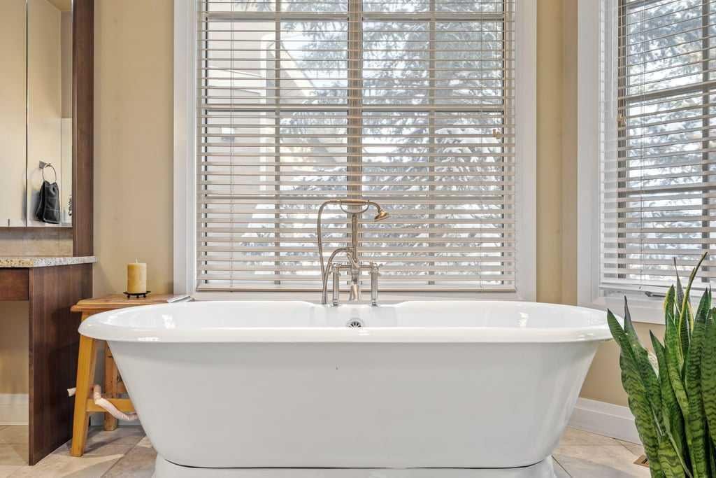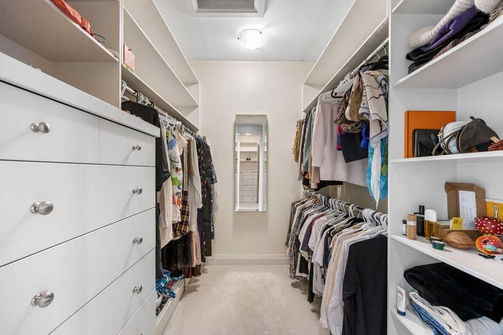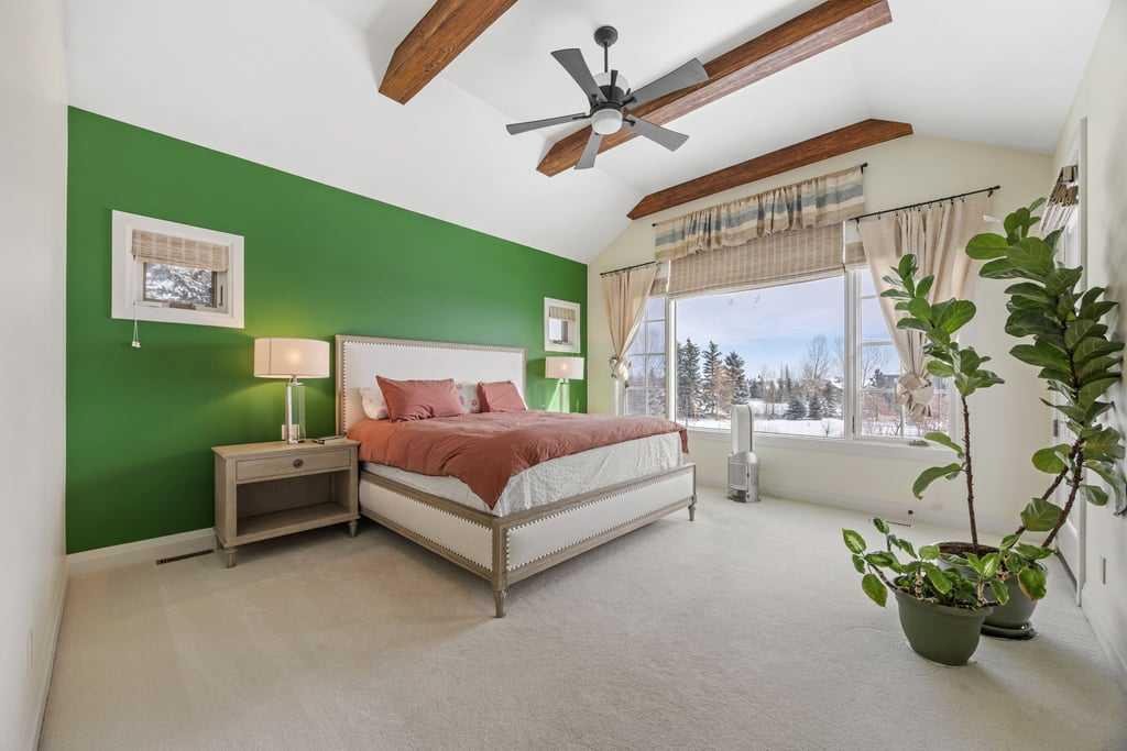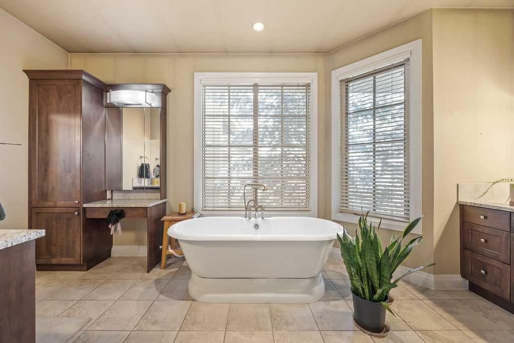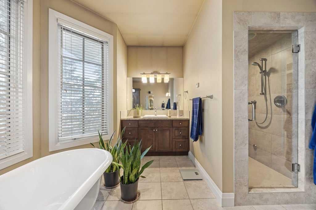 The main floor primary suite is positioned to take full advantage of the peaceful setting, with views toward the pond and a well-appointed ensuite complete with dual vanities, a soaker tub, steam shower, heated floors, and separate walk-in closets. An office, along with a functional mudroom and laundry space with built-ins, completes the main level.
