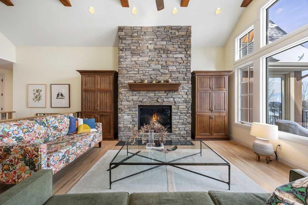 A curved driveway winds through mature landscaping, creating a strong sense of arrival as the home comes into view. Inside, soaring vaulted ceilings with exposed beams and rich hardwood floors set the tone in the main living area, where a striking stone fireplace anchors the space and invites both quiet evenings and larger gatherings.