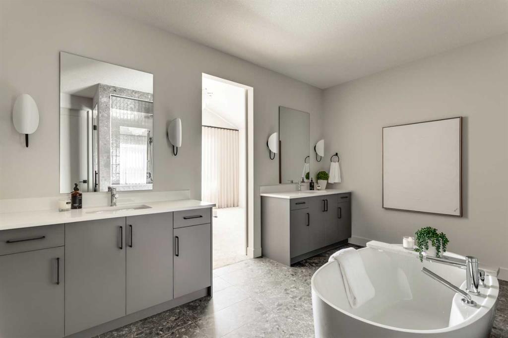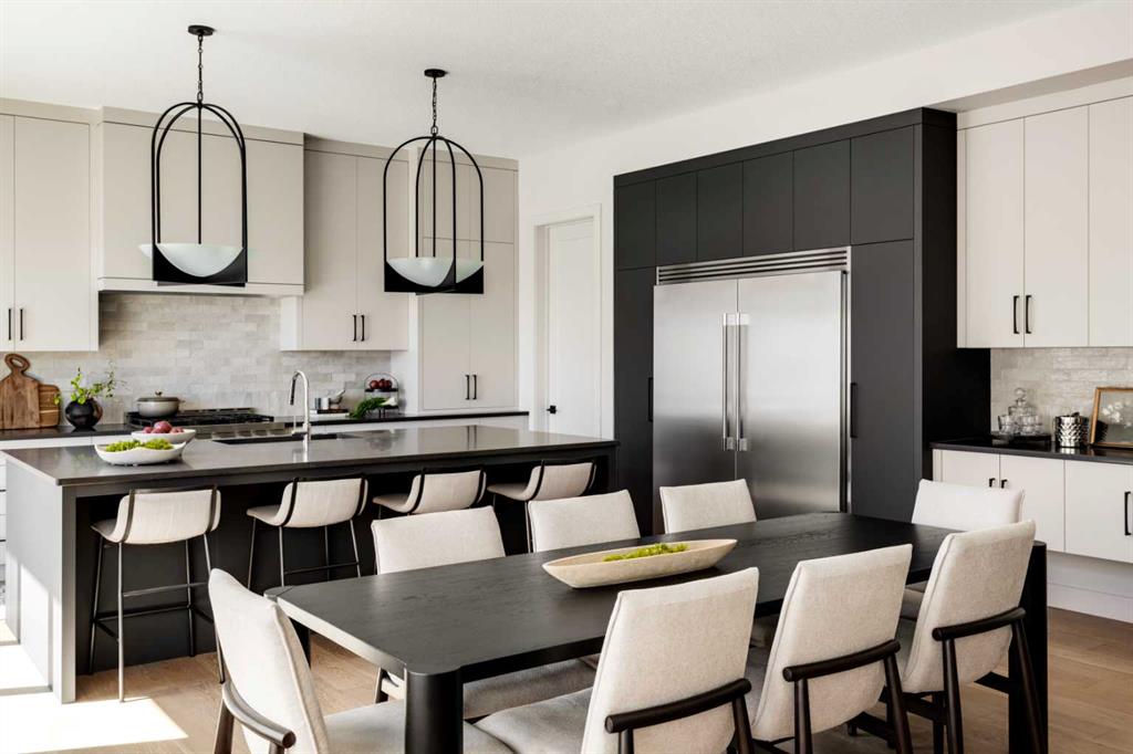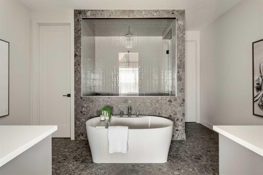 Welcome Home to Lupi Luxury Homes 8 Rockcliff Hill NW, this distinguished residence epitomizes the pinnacle of luxurious living. 4 oversized bedrooms each with their own ensuites and walk-in closets. This lovely home seamlessly integrates with its surroundings through a thoughtfully designed layout, boasting 6 bedrooms and 6 bathrooms. A standout feature is the 3-car garage with ceiling heights to accommodate a car lift. As you step inside, a wealth of high-end amenities unfolds, illuminated by natural light streaming through triple-pane Loe2 windows. The gourmet kitchen, with rich white cabinetry to the 10’ ceiling and darker oversized island, showcases a built-in stainless steel, double fridge / freezer and upgraded gas range, dishwasher, microwave, hood fan, bar fridge, creating a culinary haven for residents and guests. Elevating the living experience, the residence boasts large deck off the professionally landscaped oversized back yard. A captivating stone fireplace becomes a central focus, infusing the space with warmth and inviting ambiance. The master ensuite is a true retreat, featuring a curb less walk in shower, soaker tub and his and hers vanity sinks and a large walk-in closet. Technological sophistication with a security system includes, and various powered window coverings. The home is adorned with exposed aggregate concrete, a high-end double furnace system with two air conditioning units included, ensures year-round comfort. Elegance permeates every corner, from an exquisite