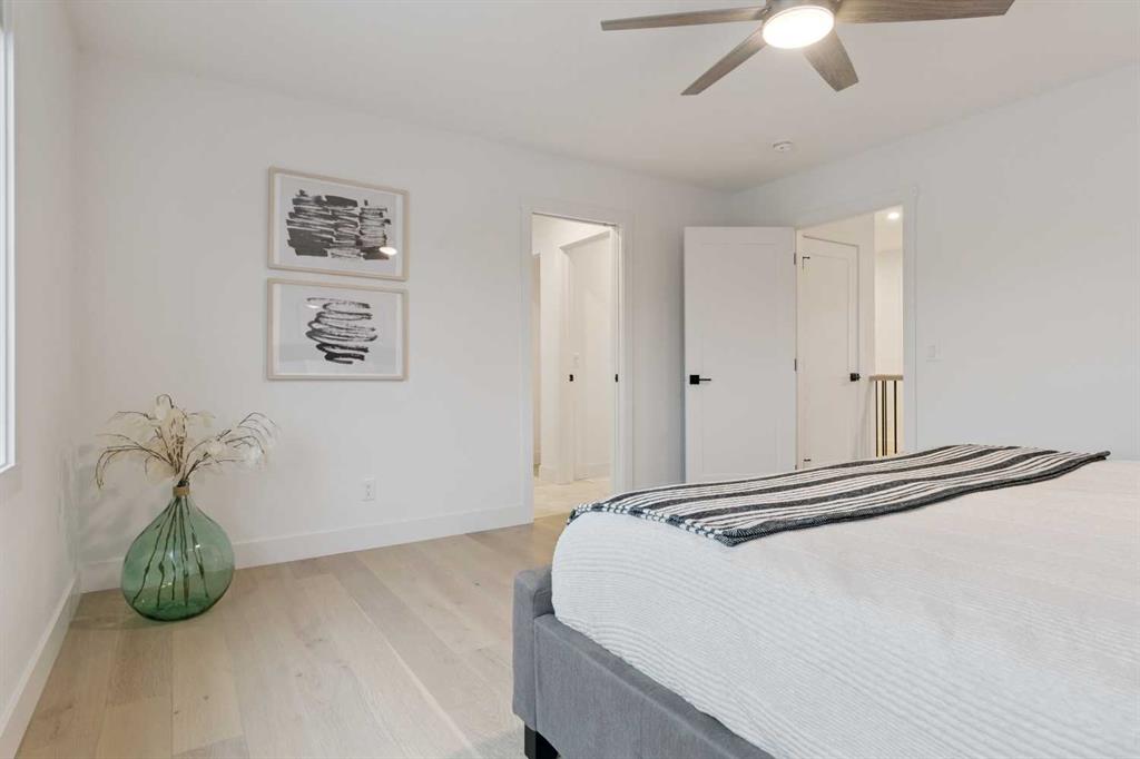 Welcome to this thoughtfully designed 2024-built, 1,975 ft² LIKE-NEW home offering 4 bedrooms, 4 bathrooms, and finished with PREMIUM UPGRADES throughout. The striking kitchen features matte black cabinetry, a matte quartz island, JennAir appliances including an integrated refrigerator, and a sleek modern aesthetic that anchors the main living space. Warm hardwood floors run throughout the home, including the staircase, creating a seamless and elevated feel.