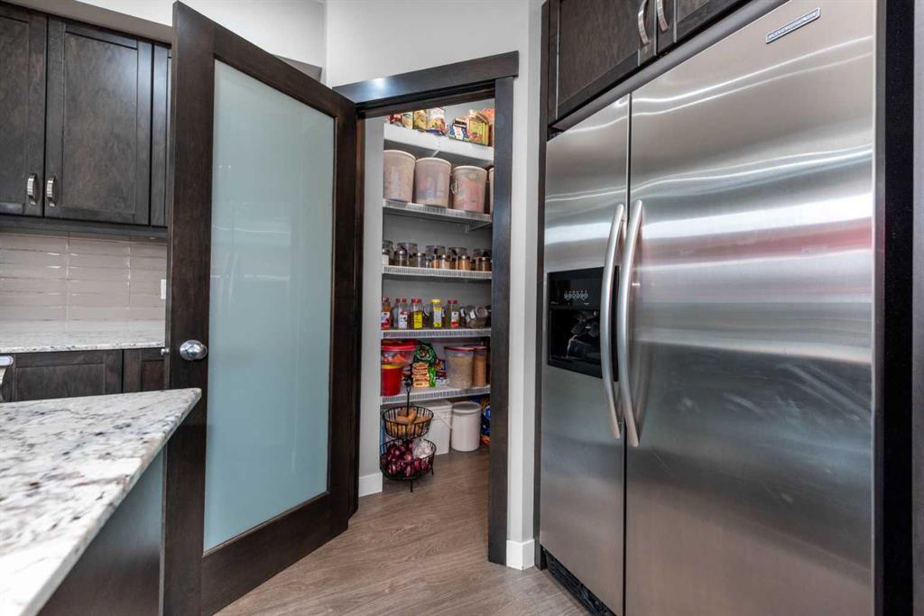 Inside, the open-concept main floor includes a gourmet kitchen with granite counters, stainless steel appliances, extended-height cabinetry with a wine rack, a massive island, and a corner pantry. The bright dining area flows into the cozy living room with a gas fireplace, creating a warm, inviting space for gatherings.