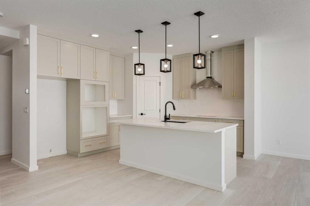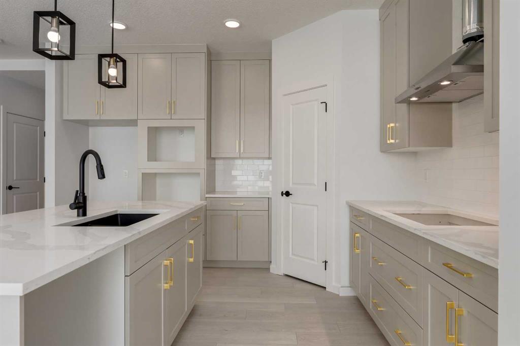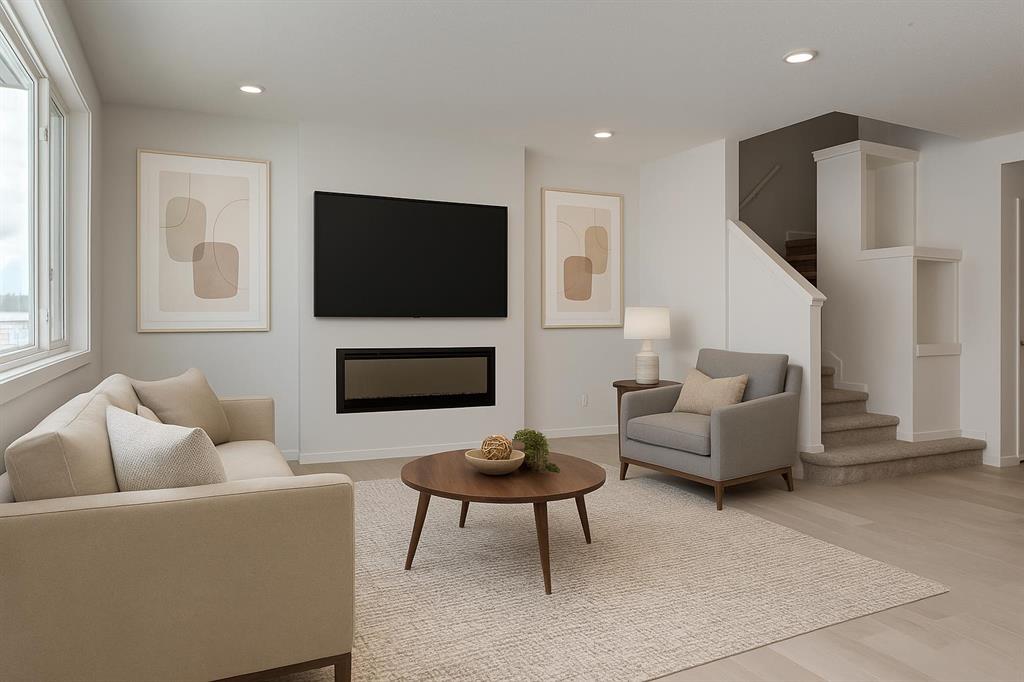 The main floor is full of “that’s actually really smart” moments. Up front, the LOUNGE doubles as a home office, hobby zone, or family command center — a space that keeps everyone organized without feeling like a workstation. Around the corner, a true FLEX ROOM sits next to a FULL THREE-PIECE BATHROOM, making overnight guests feel right at home (and giving you a future main-floor bedroom option if life ever calls for it). NINE-FOOT CEILINGS and clean sightlines make the space feel open without losing warmth, while the CUSTOMIZED kitchen quietly holds everything together: FULL-HEIGHT CABINETRY, BUILT-IN WALL OVEN AND MICROWAVE, GAS COOKTOP, AND QUARTZ COUNTERS that stay calm no matter how chaotic mornings get. The great room finishes it with a 50-INCH FIREPLACE and just the right dose of polish.