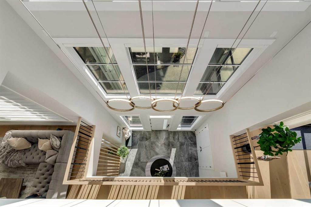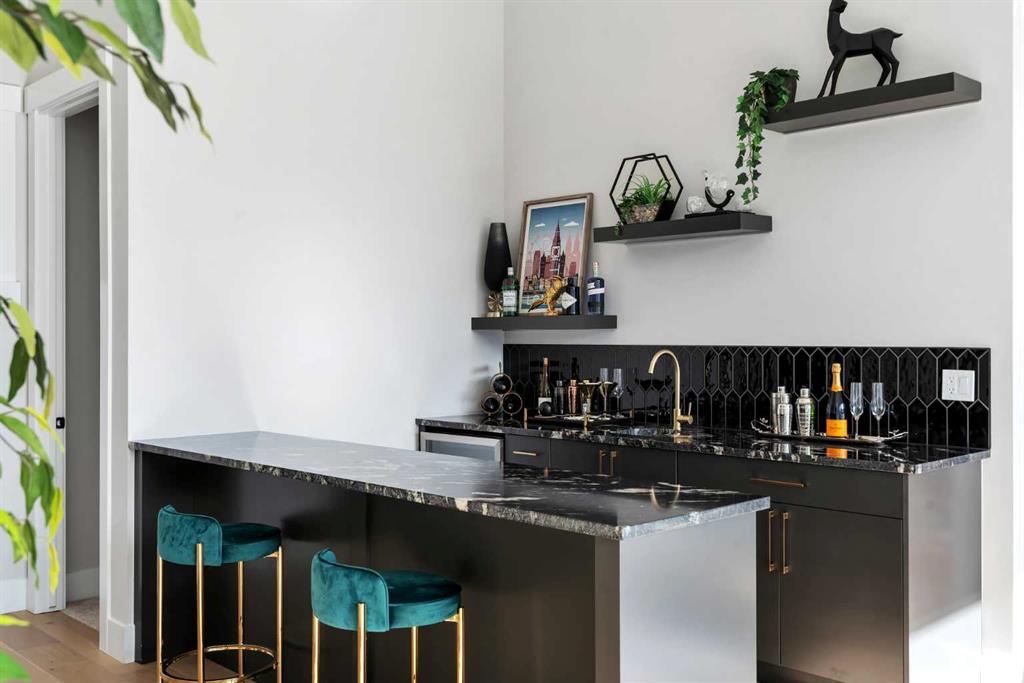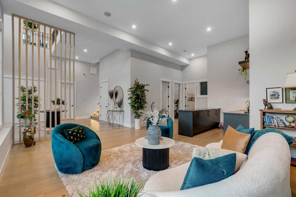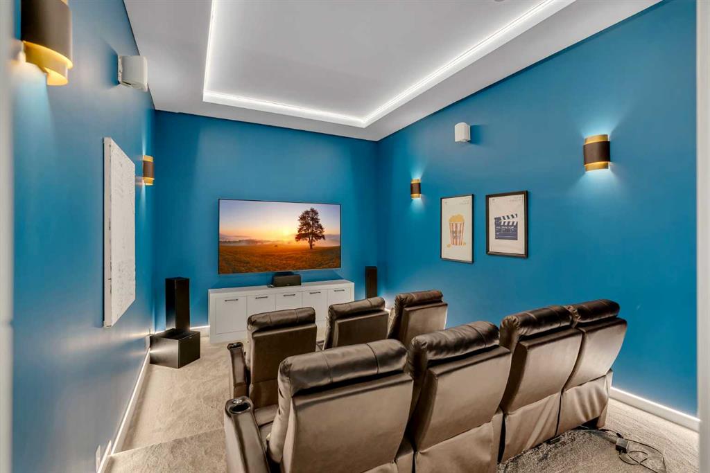 As you step inside you are greeted by a spectacular open-to-below foyer soaring approximately 30 feet, creating a rare sense of scale and elegance. Thoughtfully designed for both relaxation and upscale entertaining, this home features an elegant lounge with soaring 14-foot ceilings, built-in speakers, and ambient lighting that enhances the refined atmosphere. A custom-designed bar with sleek stone countertops, gold hardware, and backlit shelving serves as a true showpiece. This level also offers a private den, dedicated gym, fully equipped home theatre, and a spacious bedroom with a walk-in closet and full bathroom.