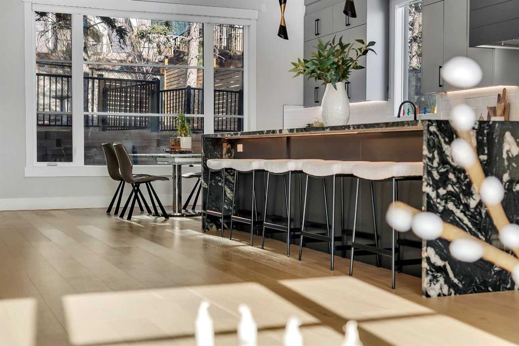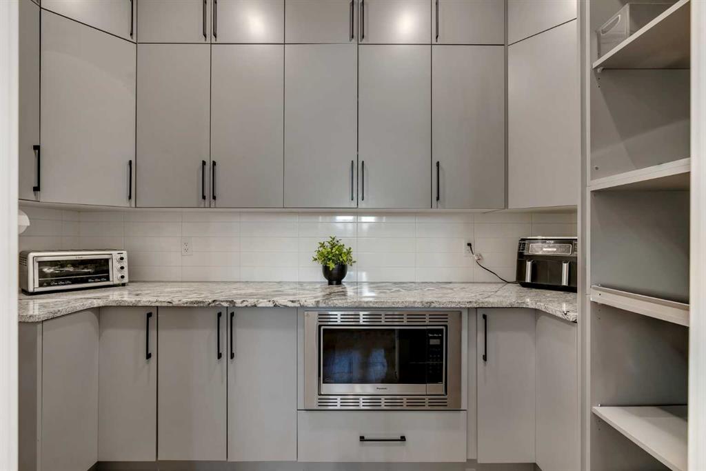 The chef’s kitchen is a true centerpiece—featuring an oversized waterfall island, top-of-the-line appliances, full-height cabinetry, elegant countertops, designer lighting, and extensive storage. A butler’s pantry and secondary prep kitchen complete with gas stove and additional appliances make this home ideal for entertaining.