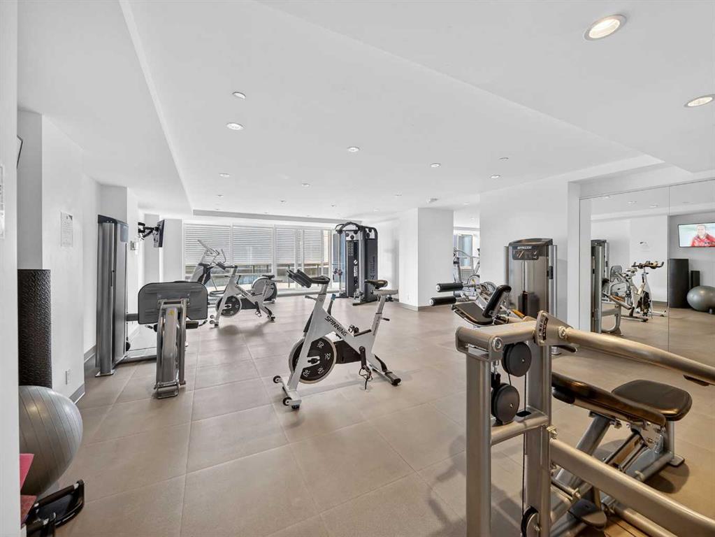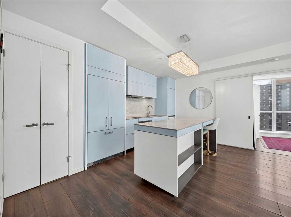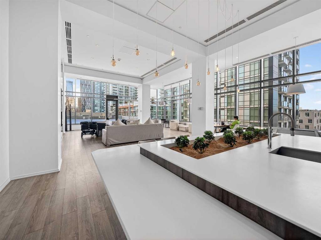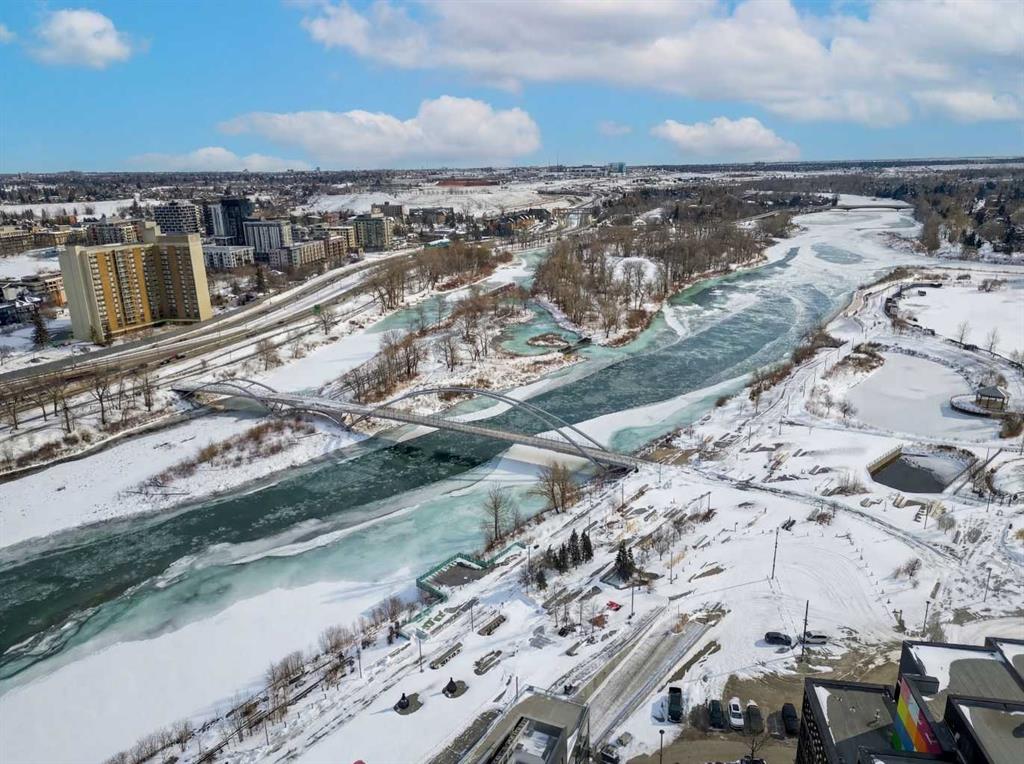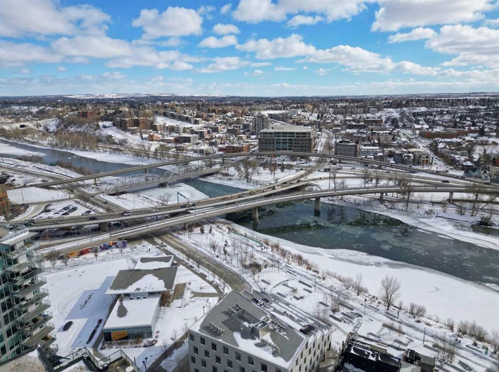 This is downtown living at its best. Welcome to this stunning corner unit in The Verve, located in the heart of East Village — one of Calgary’s most vibrant and walkable communities. This modern 2-bedroom, 2-bathroom condo features floor-to-ceiling windows with panoramic west-facing views, an open-concept layout flooded with natural light, and a sleek kitchen complete with quartz countertops, built-in oven, electric cooktop, and fully integrated appliances. The bright corner primary bedroom offers a stylish 3-piece ensuite, while the second bedroom is thoughtfully positioned on the opposite side of the unit beside a full 4-piece bathroom — ideal for guests, roommates, or a home office. Additional highlights include full-size in-suite laundry, central A/C, custom blinds, and a covered west-facing balcony with a BBQ gas line and space for patio furniture. The Verve offers exceptional amenities including full-time concierge, a fully equipped fitness centre, large social lounge with outdoor patio and fire tables, guest suites, bike storage, visitor parking, and a spectacular 25th-floor rooftop patio with breathtaking views of the downtown core, mountains, and river valley. All just steps from the River Walk, Bow River pathways, St. Patrick’s Island, Studio Bell, the Central Library, restaurants, cafés, and more. Underground titled parking and assigned storage included — an exceptional opportunity to own a premium corner unit in one of Calgary’s most desirable downtown locations.