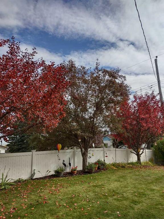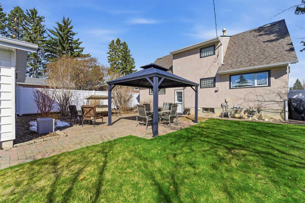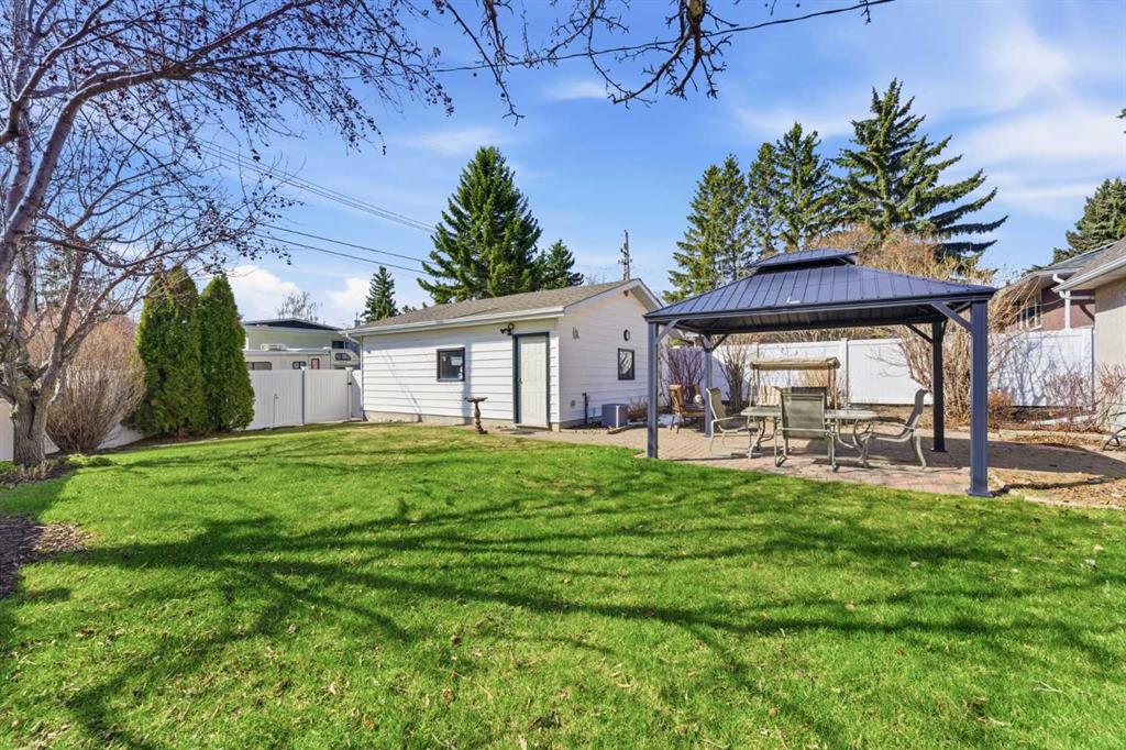 Outside, enjoy the thoughtfully landscaped yard with mature trees, a brick patio, and a new vinyl fence—perfect for relaxing or entertaining in your private outdoor space. The exposed aggregate walkway adds to the home’s curb appeal, while the double detached garage provides ample parking and storage.