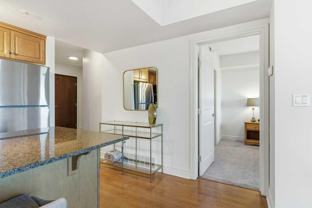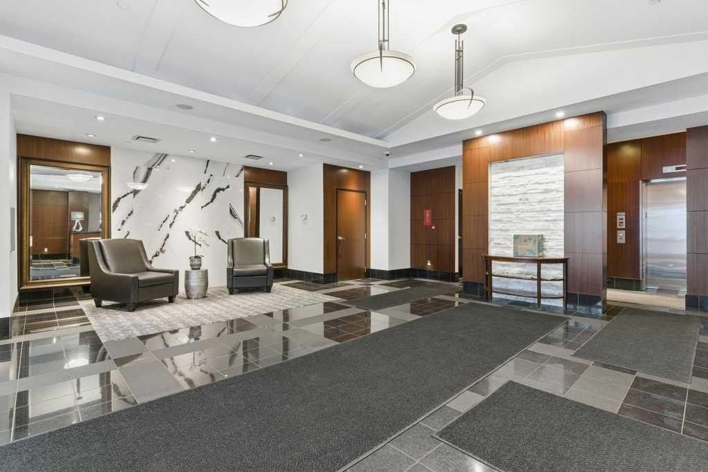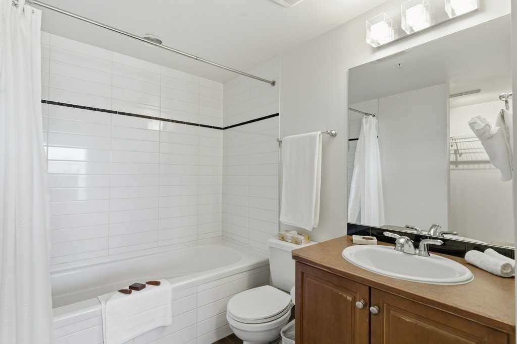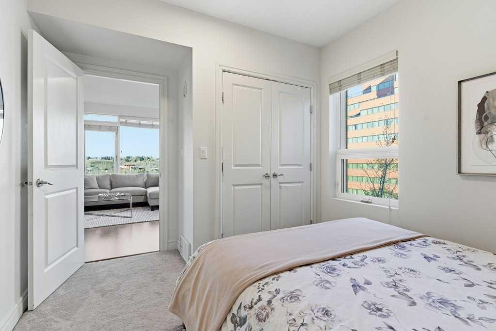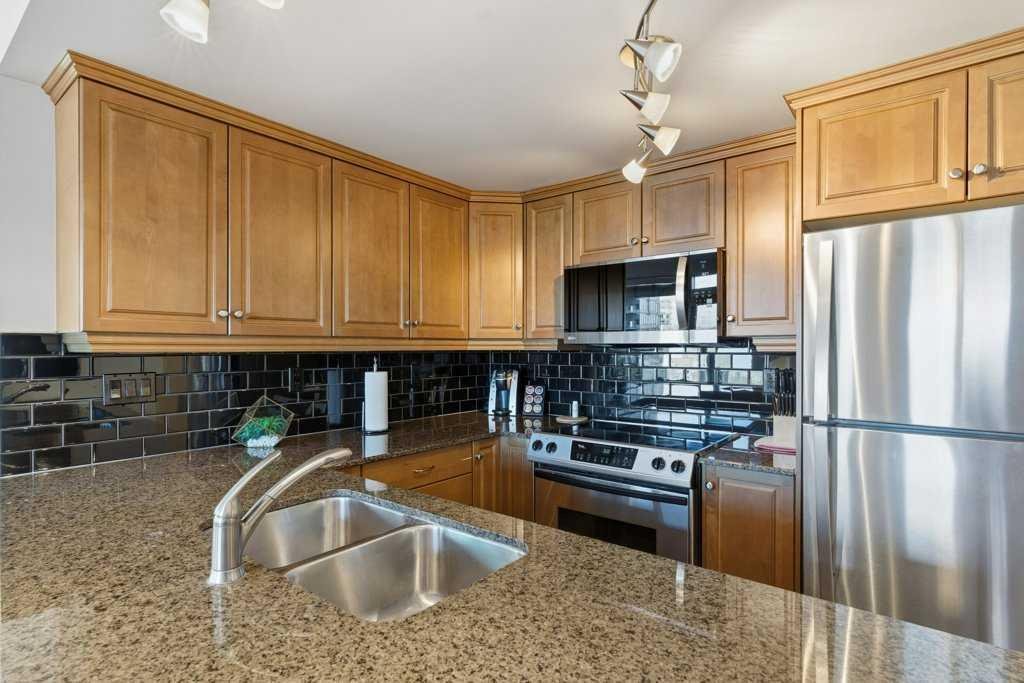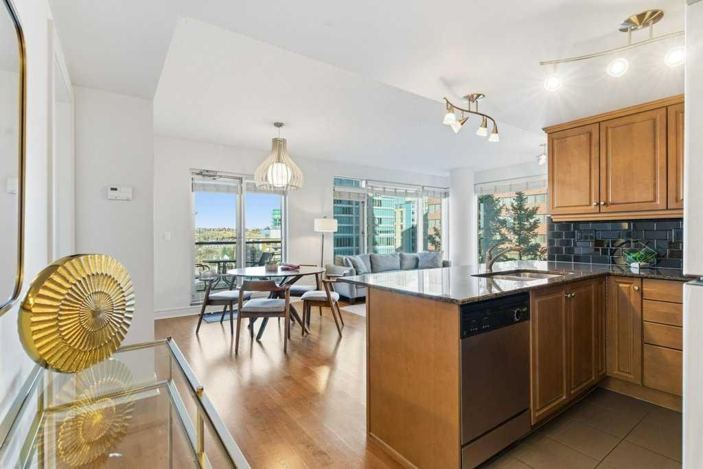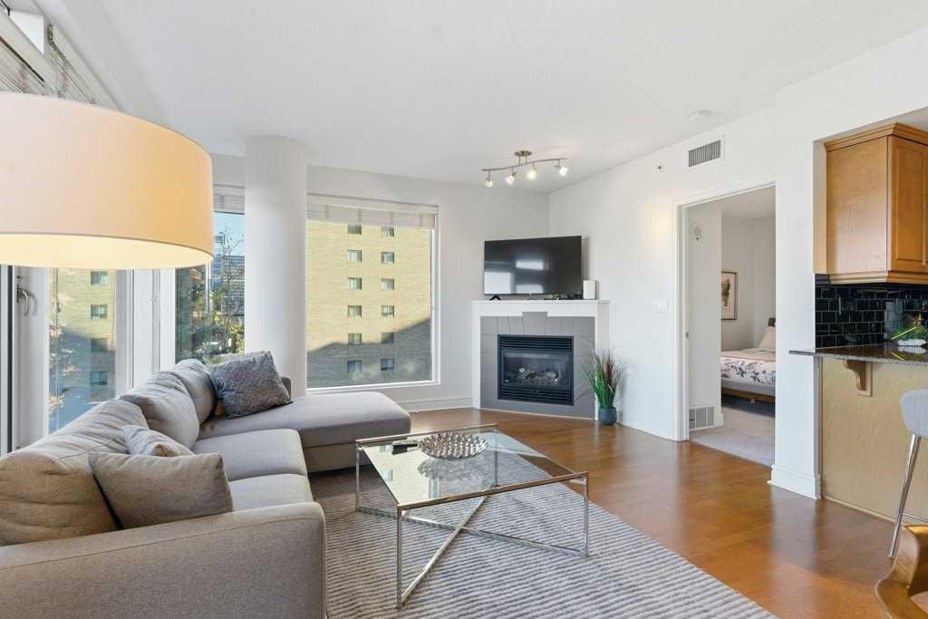 Urban Living at Its Best — Fully Furnished Executive Suite at Five West II. Experience luxury downtown living without the luxury price tag. This stylish, fully furnished 8th-floor executive suite in Five West Phase II delivers unbeatable river and city views — including the Bow River, Peace Bridge, and Kensington — by day and by night. The smart open-concept layout is designed for real life in the city. Host friends comfortably, work from home, or enjoy a cozy night in front of the gas fireplace with your favorite wine. Floor-to-ceiling windows flood the living and dining area with natural light, highlighting the sleek kitchen featuring Legacy cabinetry, granite counters, and stainless steel appliances. The spacious primary suite offers room for a king-size bed, a walk-in closet, and a private ensuite with modern finishing. A generous second bedroom with a cheater ensuite is perfect for guests or a home office. You’ll love the thoughtful extras too — front entry work-nook or storage option, in-suite laundry, air conditioning, and laminate flooring throughout. Titled underground heated parking + storage locker. Five West II brings elevated amenities to your doorstep, including a residents’ lounge with billiards and full kitchen, outdoor terrace, car wash bay, and full-time concierge service. Step outside and you’re moments from the Bow River pathways, Prince’s Island Park, top-tier dining, boutique shopping, transit, and downtown energy. This turnkey suite shows beautifully and offers the ultimate downtown lifestyle — views, convenience, comfort, and sophistication. Move in and start living your best city life.