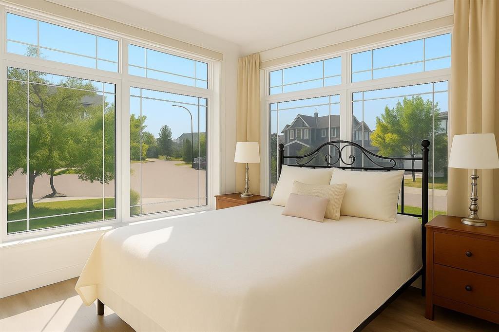Upstairs has an air of sophistication with a lovely family room that overlooks the foyer – the perfect place for cozy movie nights. Architectural detail and arched doorways add a level of sophistication. The king-sized primary suite is a true retreat with its large windows, spa-like ensuite with maple cabinets, a soaker tub, walk-in glass shower, private water closet, and a sun-filled walk-in closet with its own window. Two additional well-sized bedrooms share a conveniently located main bath, and the laundry room – also with a window – is upstairs where you need it most.