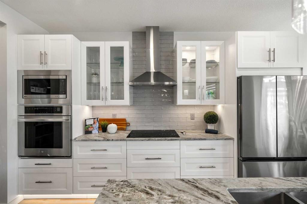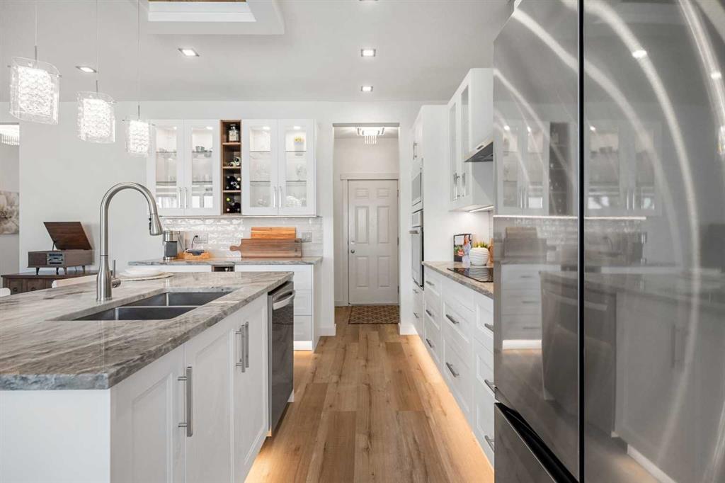 *OPEN HOUSE SAT NOVEMBER 8th 1-3PM* What a fantastic family home!! Nestled on one of the most sought-after streets in award-winning Cooper’s Crossing, this stunning home is designed to impress. Step inside and be greeted by a gorgeous, open foyer with soaring ceilings and a grand staircase as well as a main floor bedroom that easily fits a queen-sized bed and could be used as a home office or homeschool space. Before you enter the main living area you find a fabulous and well situated guest bath perfectly tucked away. The living space dramatically opens with 9FT ceilings, wide vinyl plank flooring, adjustable LED pot lights and chandeiler, and oversized windows with custom blinds, all allowing for plenty of light.